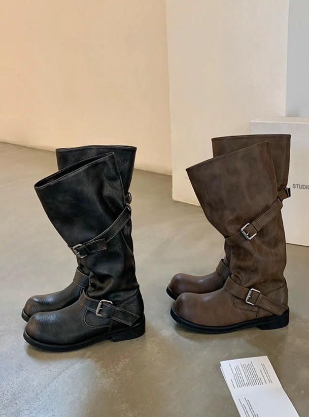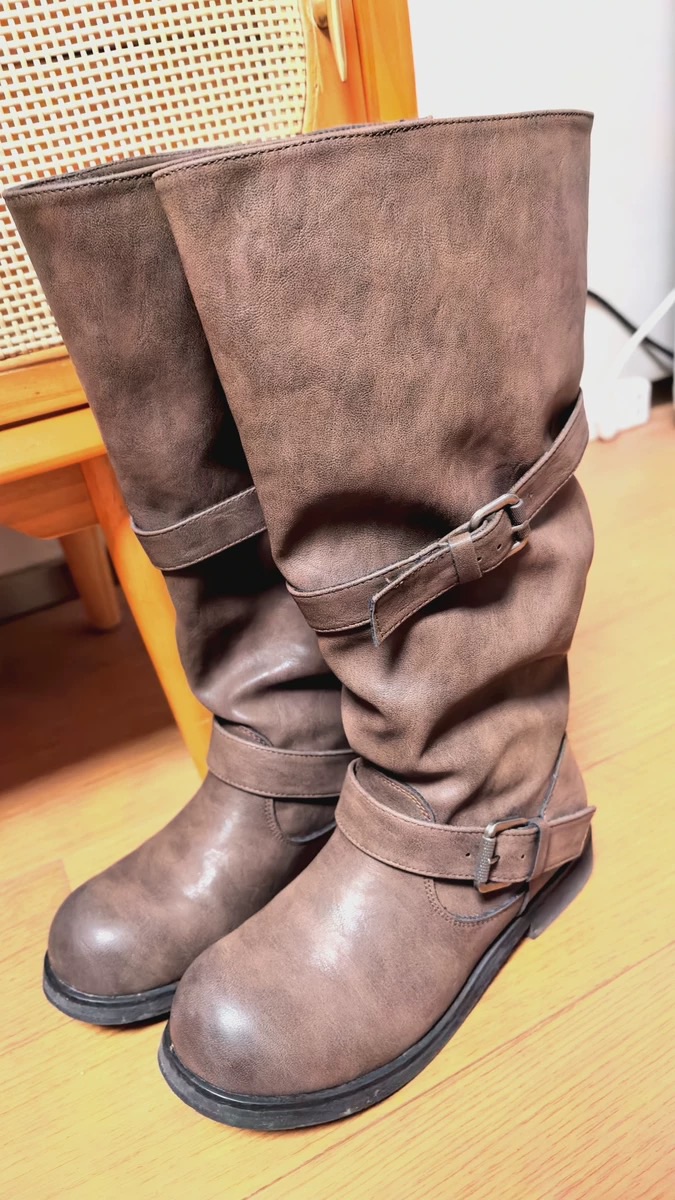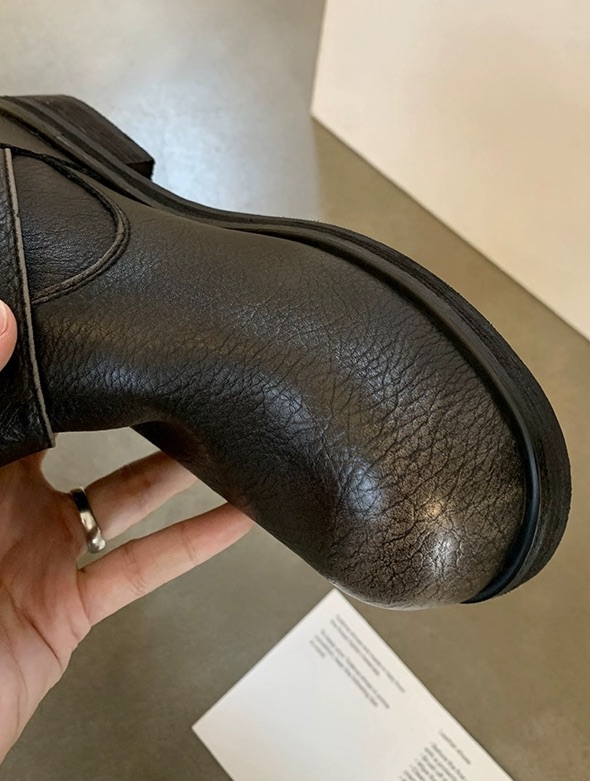 皮面紋理精緻自然:棕色柔霧、黑色帶粗獷紋路 → 復古做舊 × 圓頭顯瘦外翻版型,穿起來立刻有時裝感。