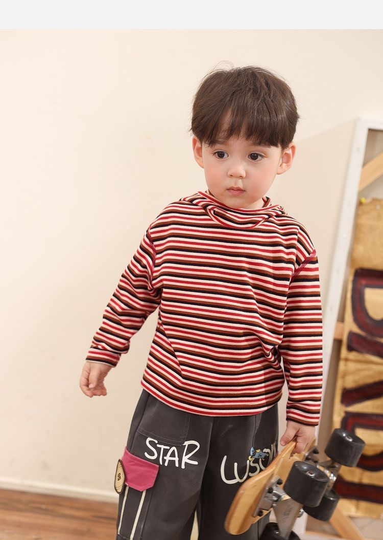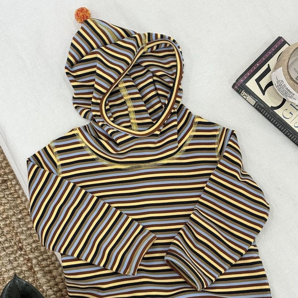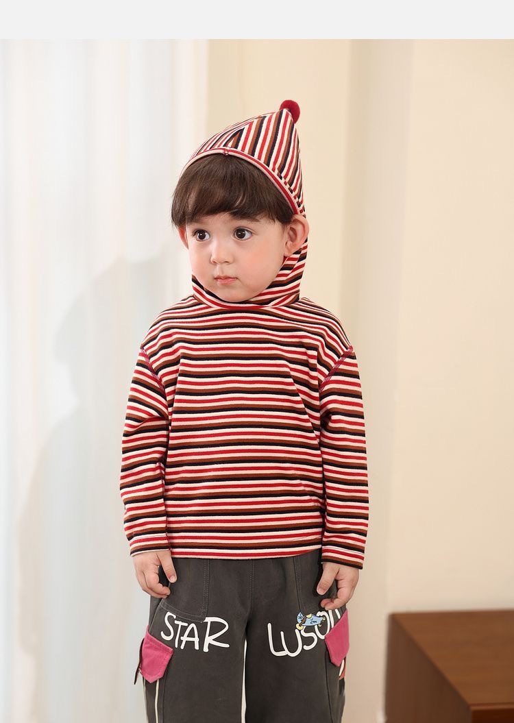 這款是偏日常實穿型的條紋連帽上衣,配色復古耐看,