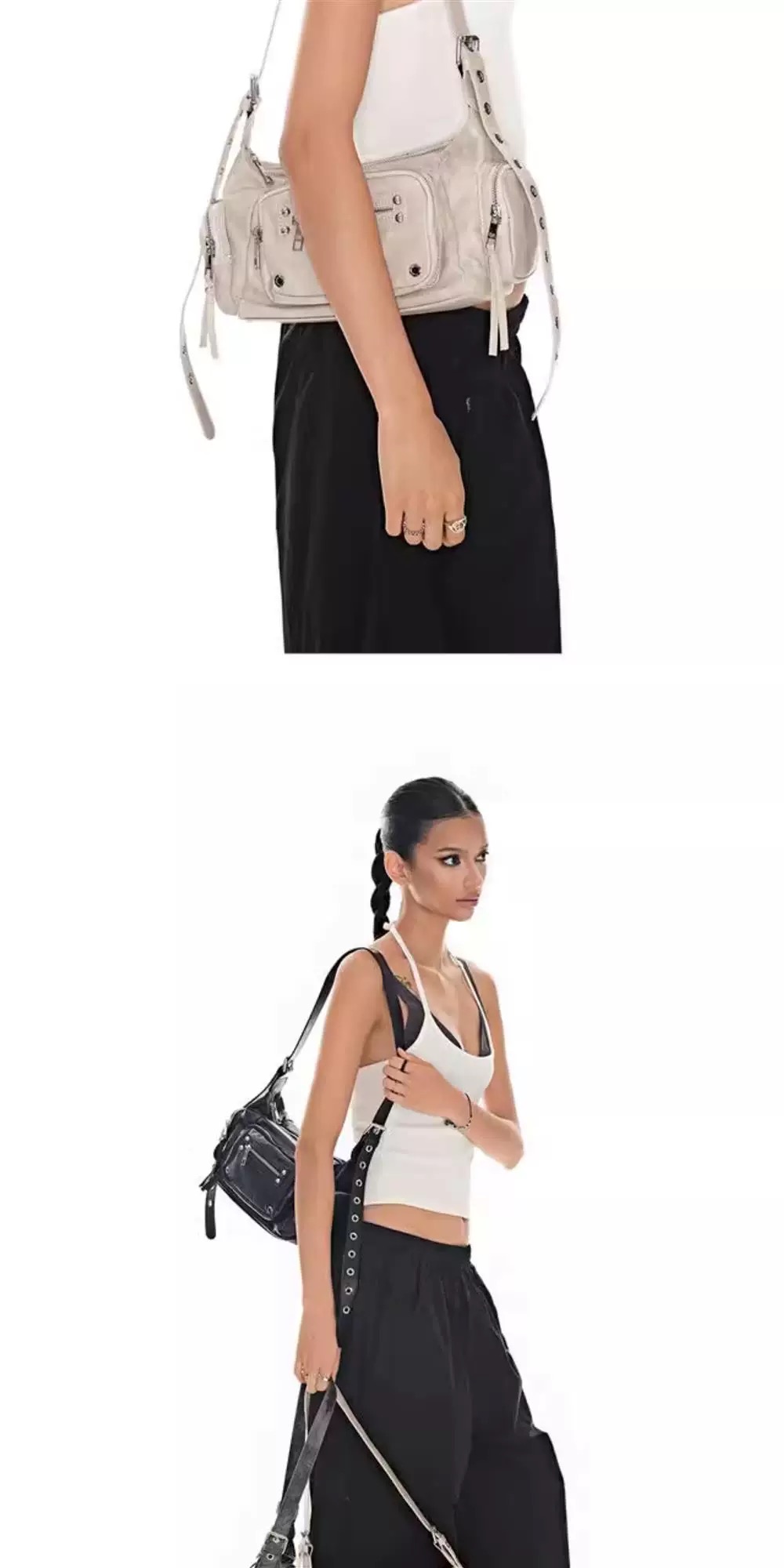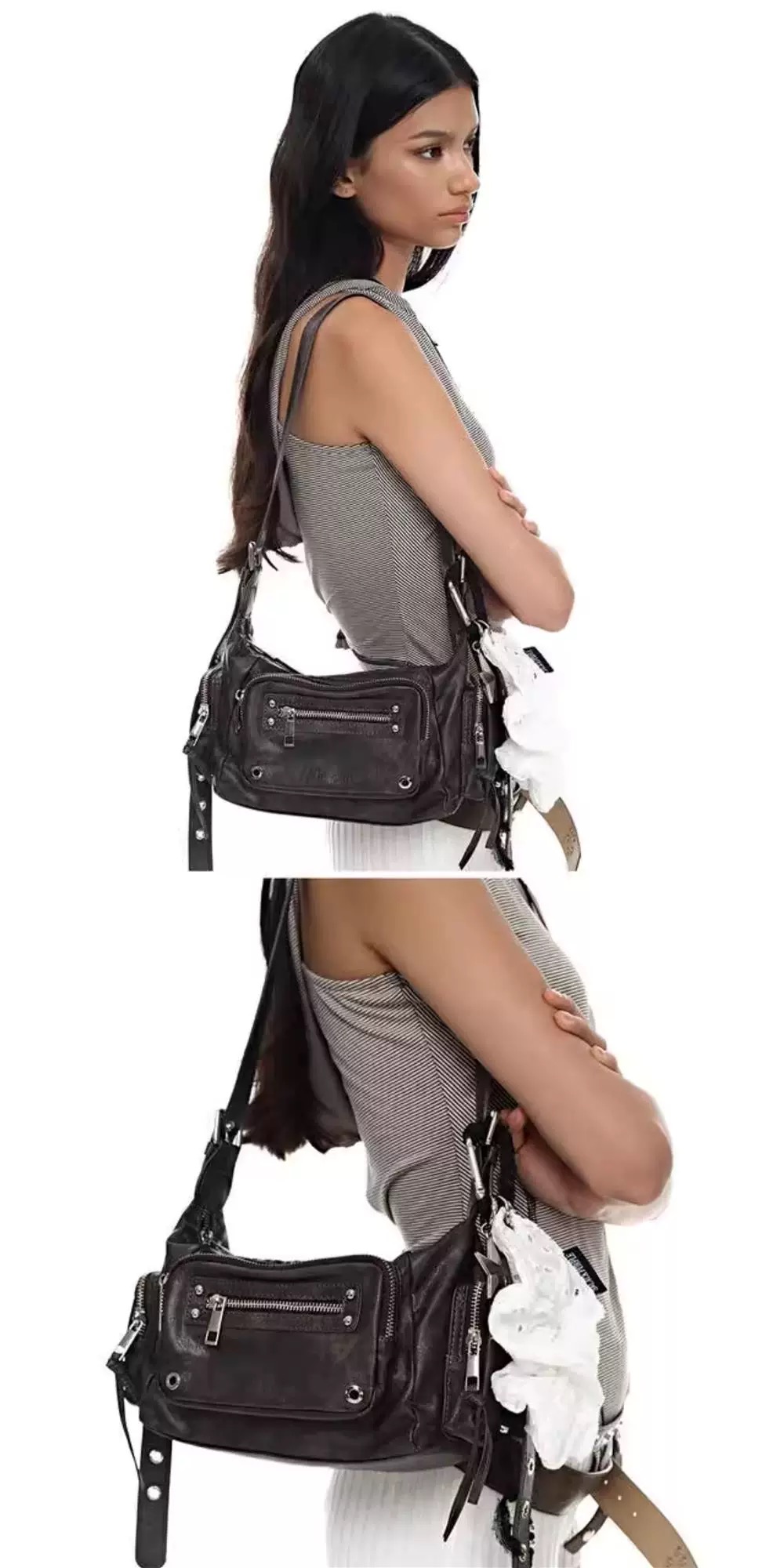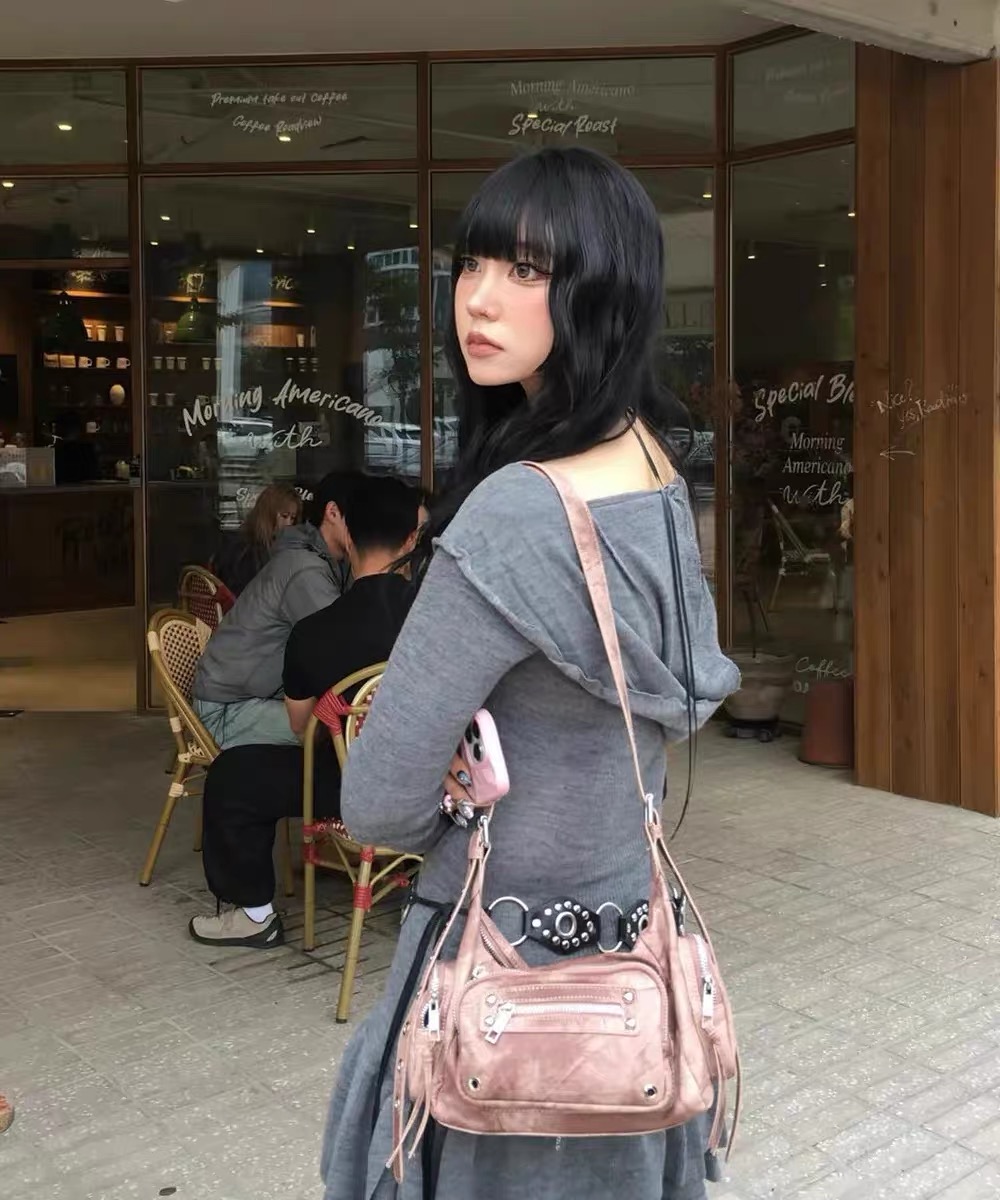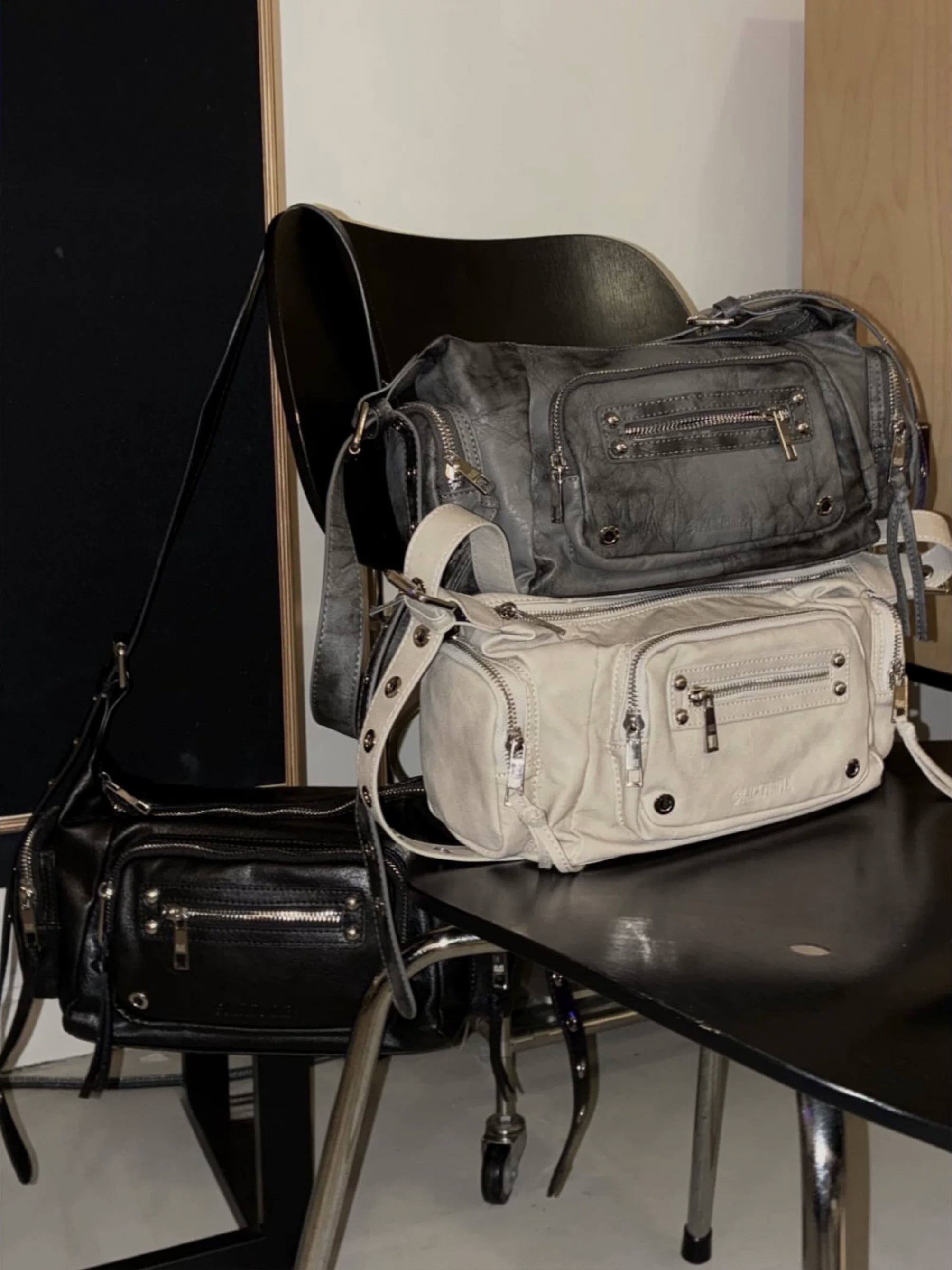 霧感皮革搭配金屬拉鍊與鉚釘元素,輪廓俐落、風格鮮明,