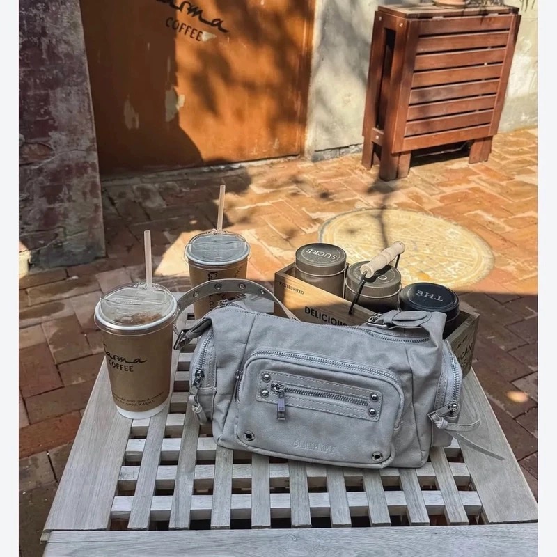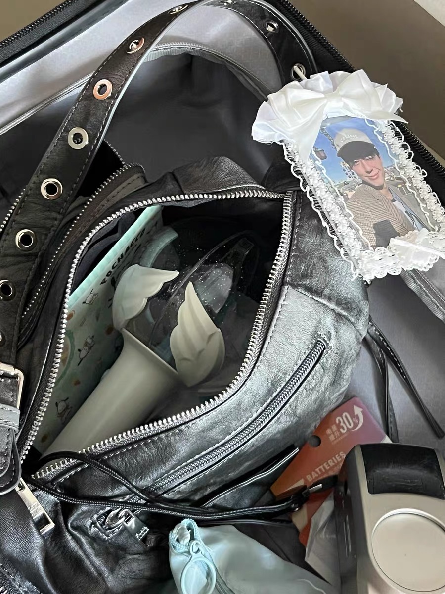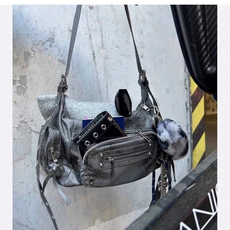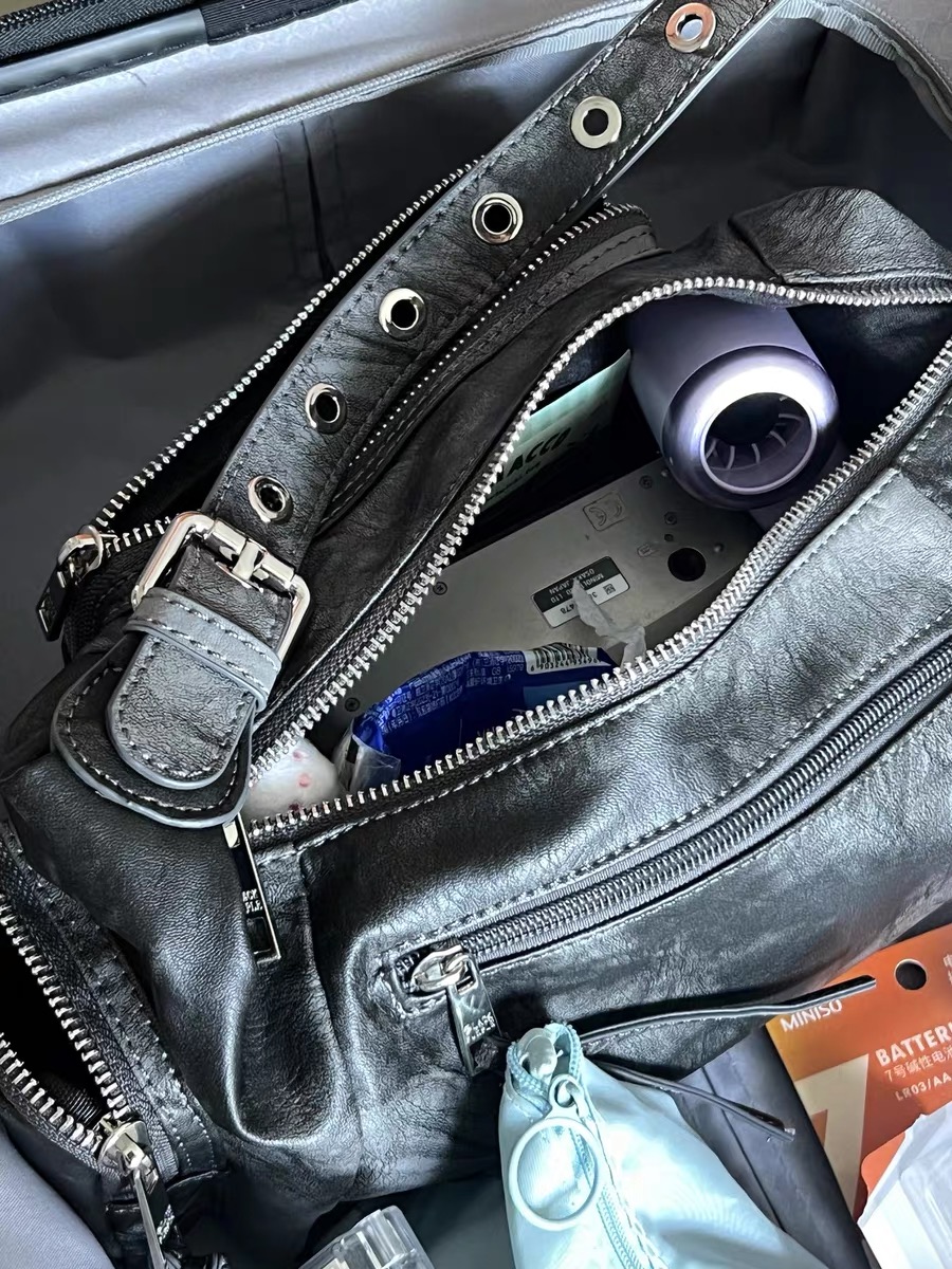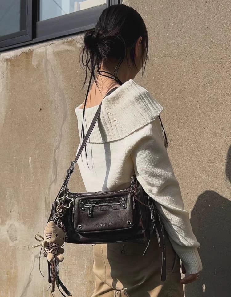 霧感皮革搭配金屬拉鍊與鉚釘元素,輪廓俐落、風格鮮明,
