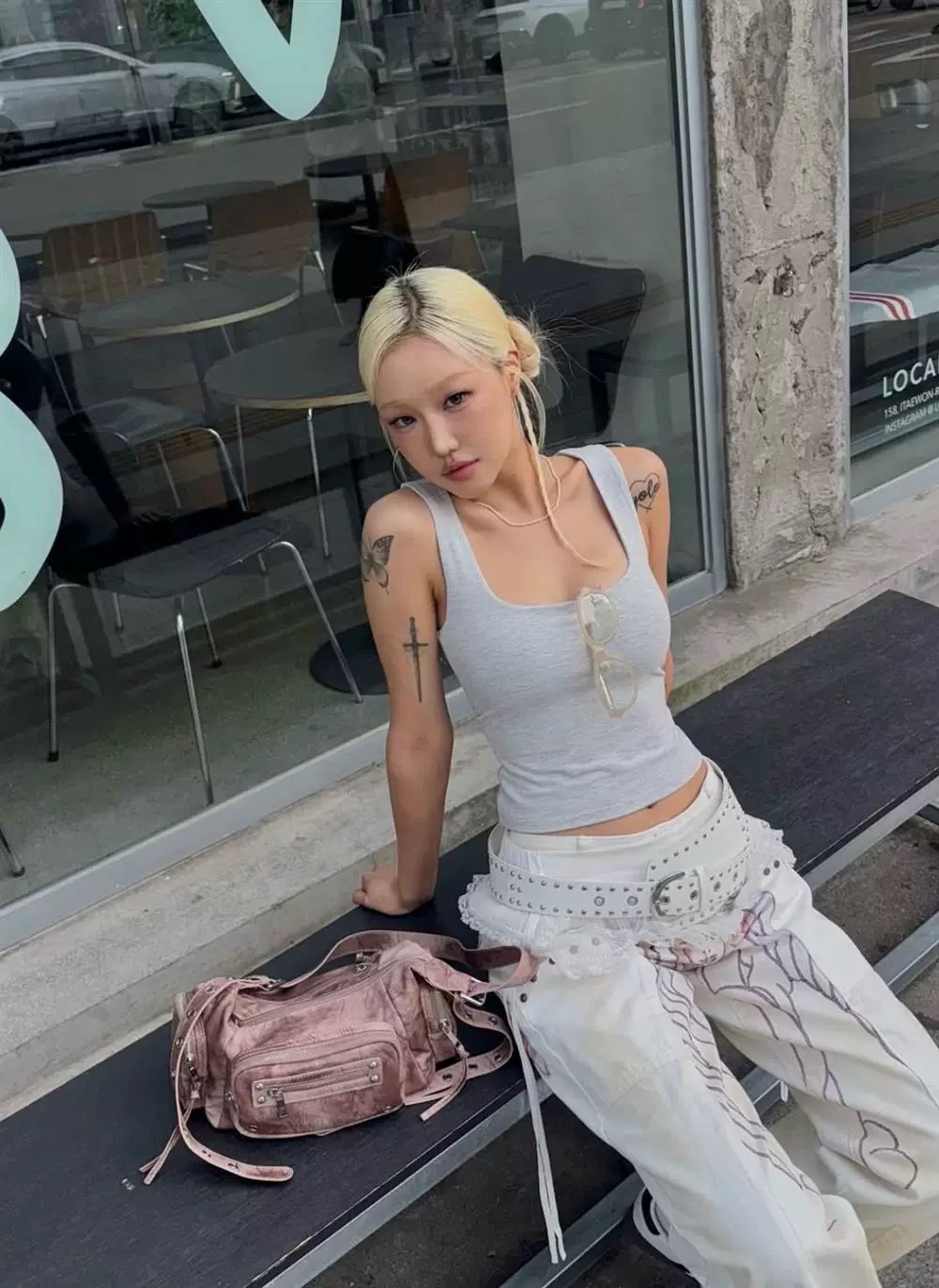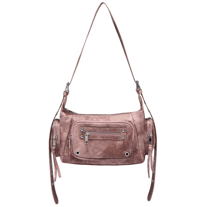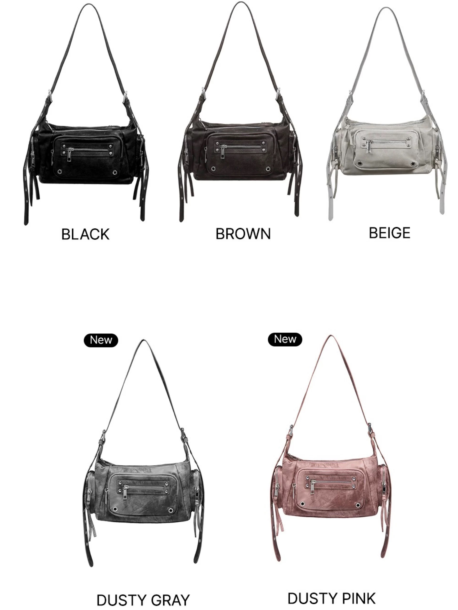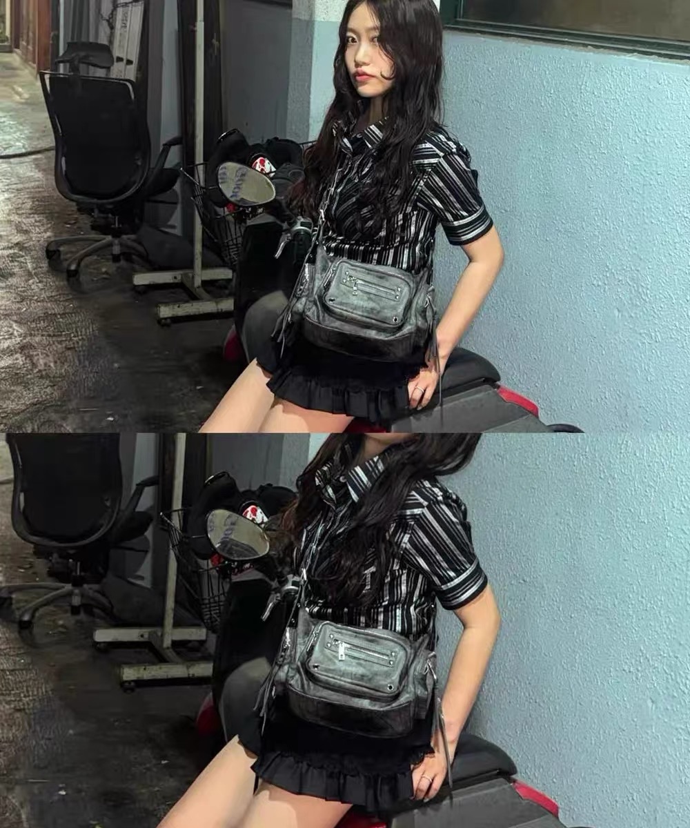 霧感皮革搭配金屬拉鍊與鉚釘元素,輪廓俐落、風格鮮明,