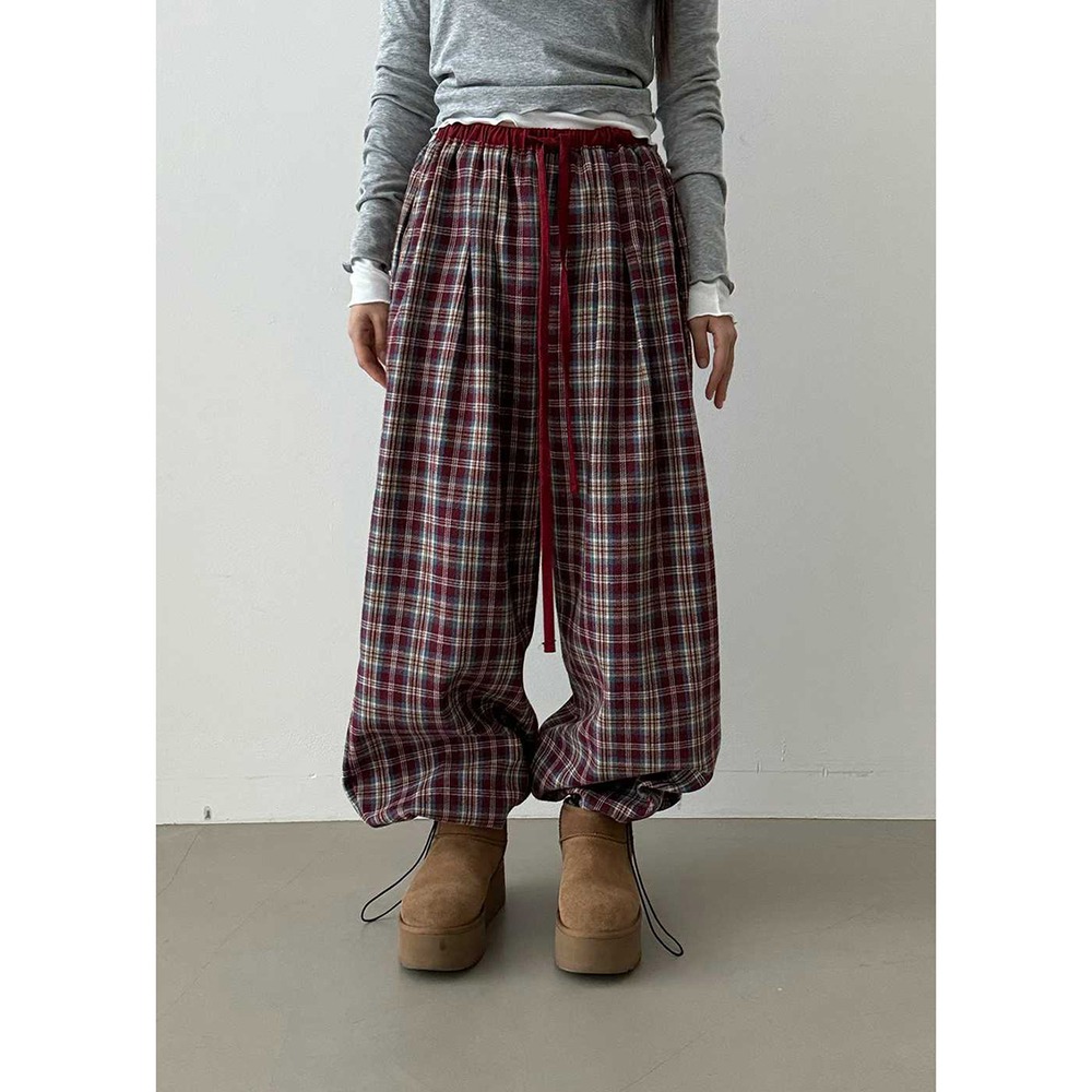 ・雙側口袋設計,實用方便 ・鬆緊腰圍+抽繩可調整 ・束腳立體剪裁,搭靴超好看 ・韓國復古格紋布料,柔軟保暖不厚重