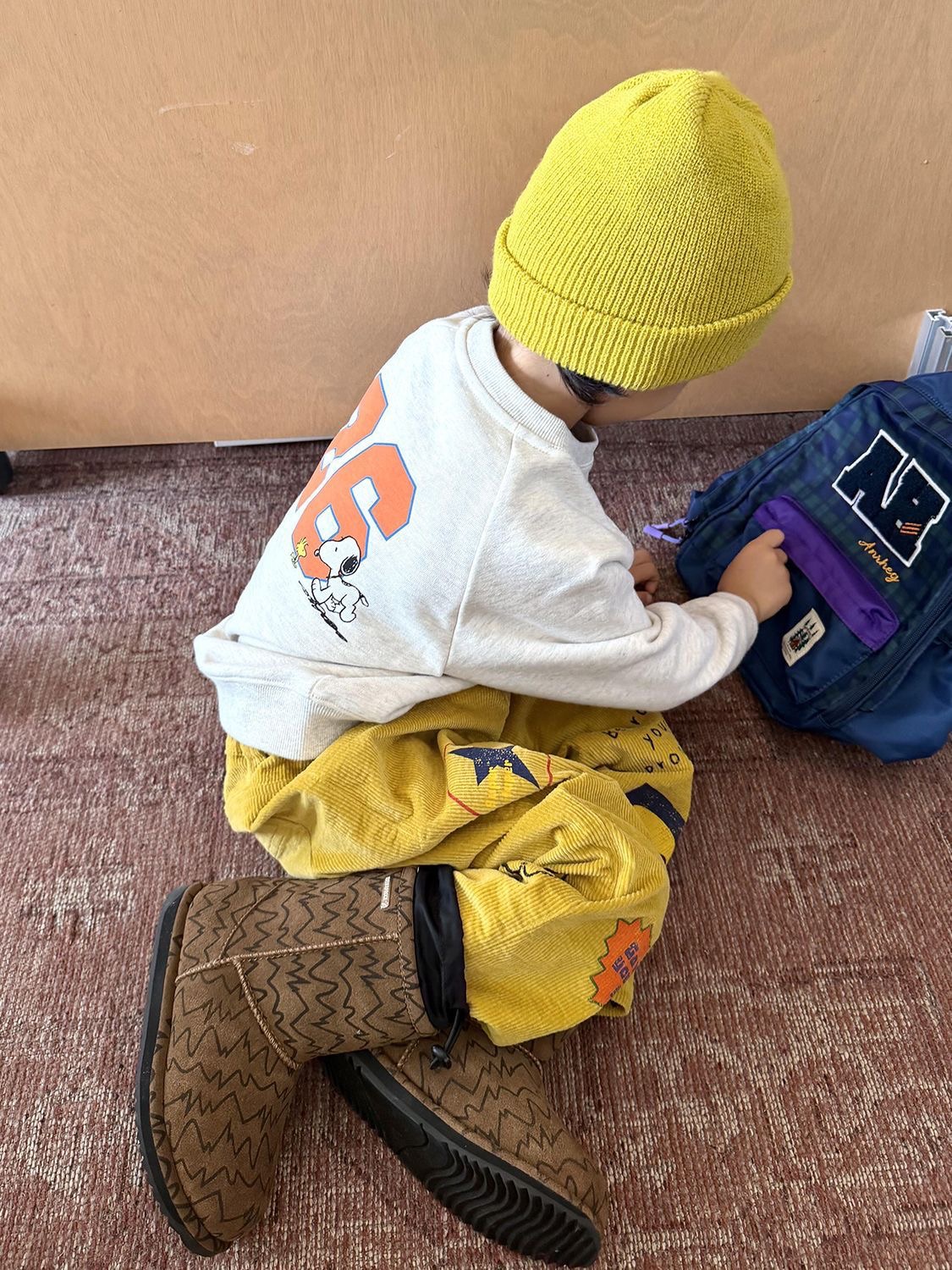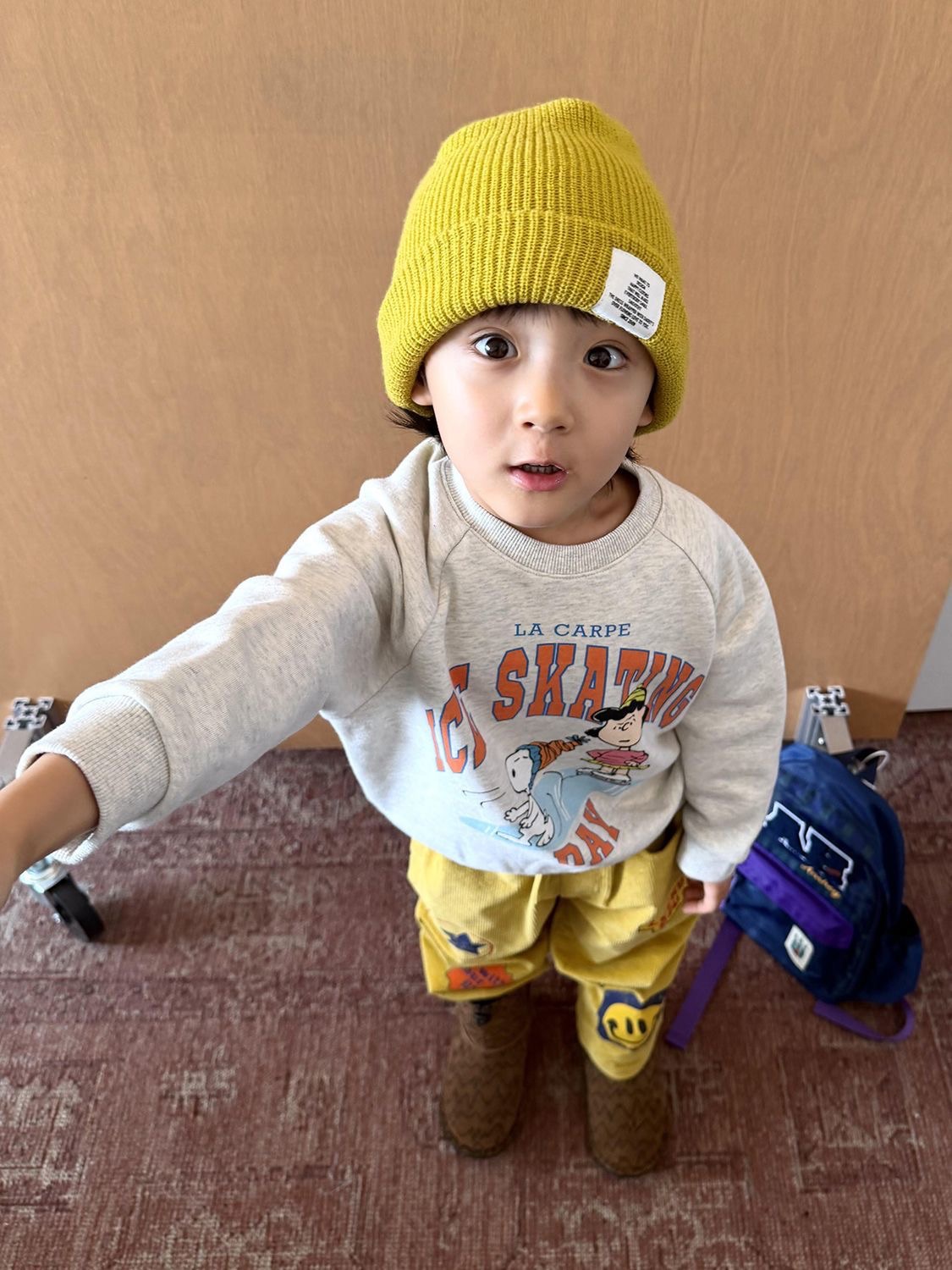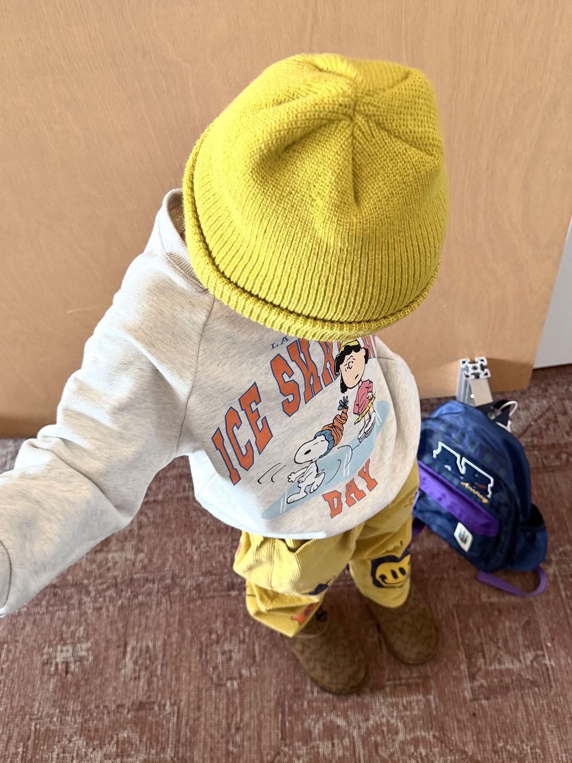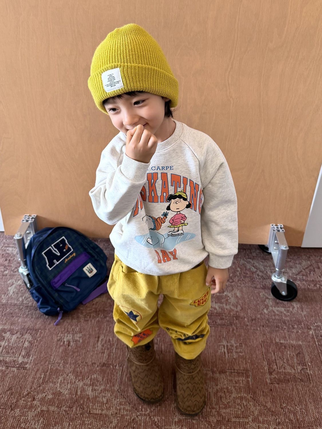 一套直接把秋冬的可愛度跟舒適度拉滿。 上衣是灰色史努比印花,搭黃色休閒褲,視覺超亮眼,拍照辨識度很高。 整套都有做 內刷毛加絨,保暖但不臃腫,日常外出超好搭。