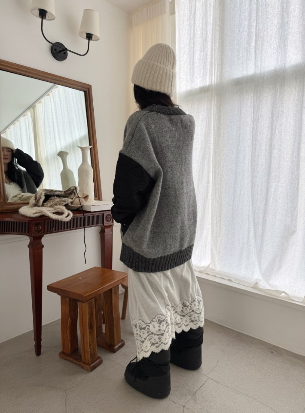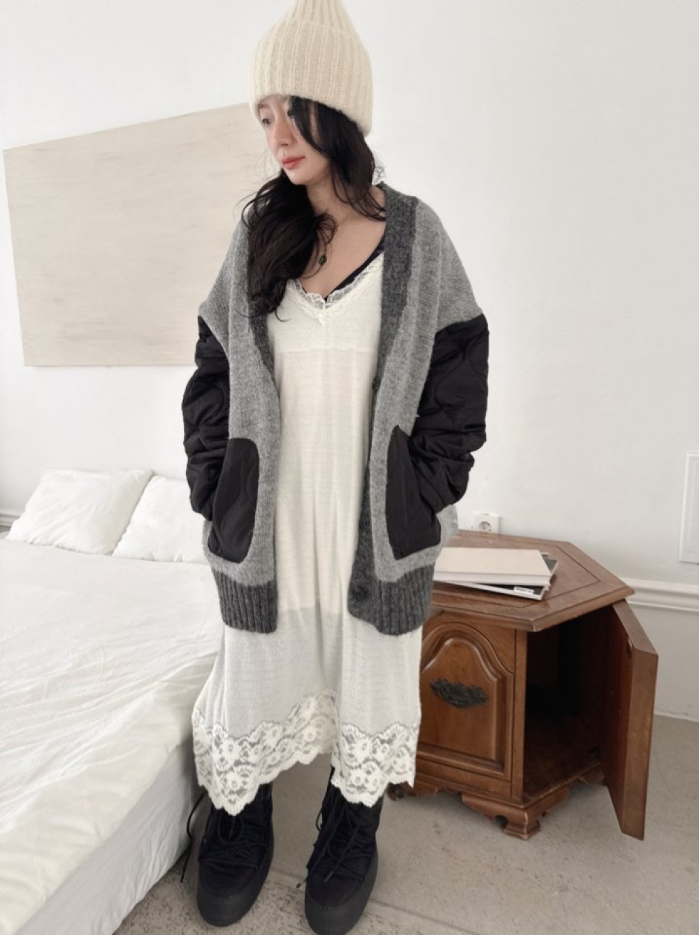 以柔軟針織為主體,搭配鋪棉拼接設計, 視覺有層次,穿起來卻不厚重。