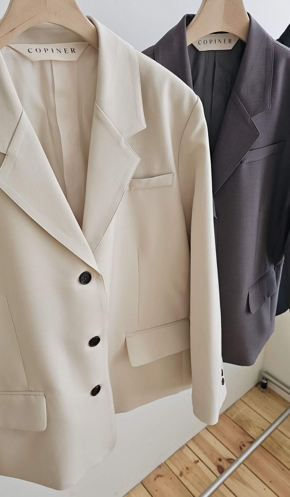 非常淺的杏色提亮氣色,高級感暗灰和經典黑色~ 觸感精緻高級,手感非常細緻,面料薄而有挺度,輕盈不壓身👌 整件都有高質感全內裡,兩側口袋,極薄墊肩,霧面琥珀釦 微寬版型,建議XS~L穿著
