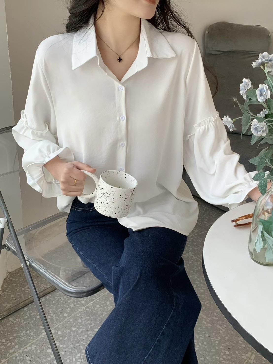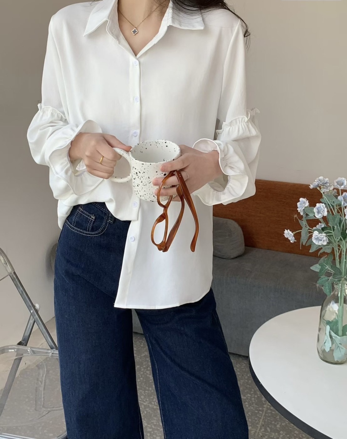 滑順垂墜感面料 穿起來自然柔軟不僵硬 經典翻領設計修飾臉型線條 袖口拼接小荷葉抓皺