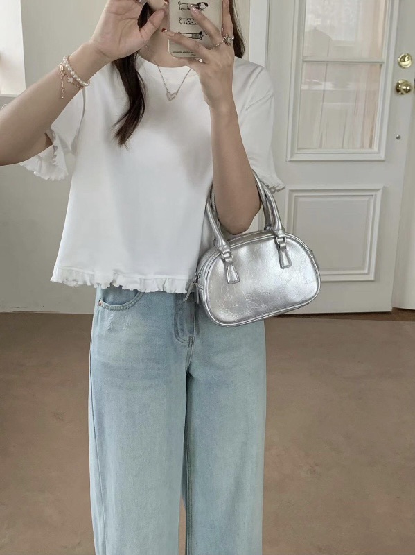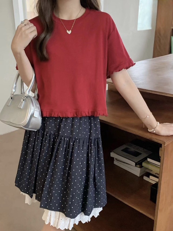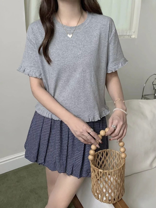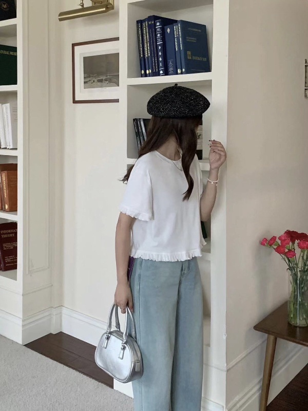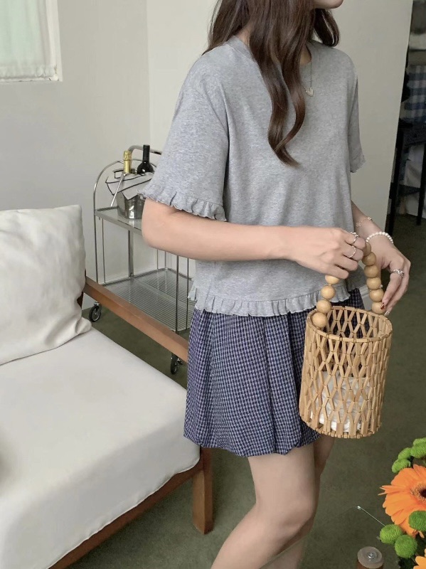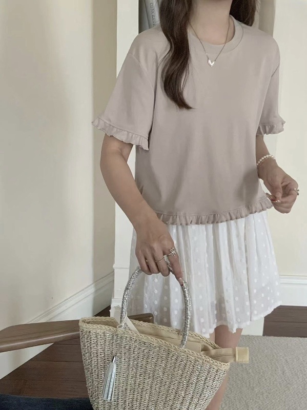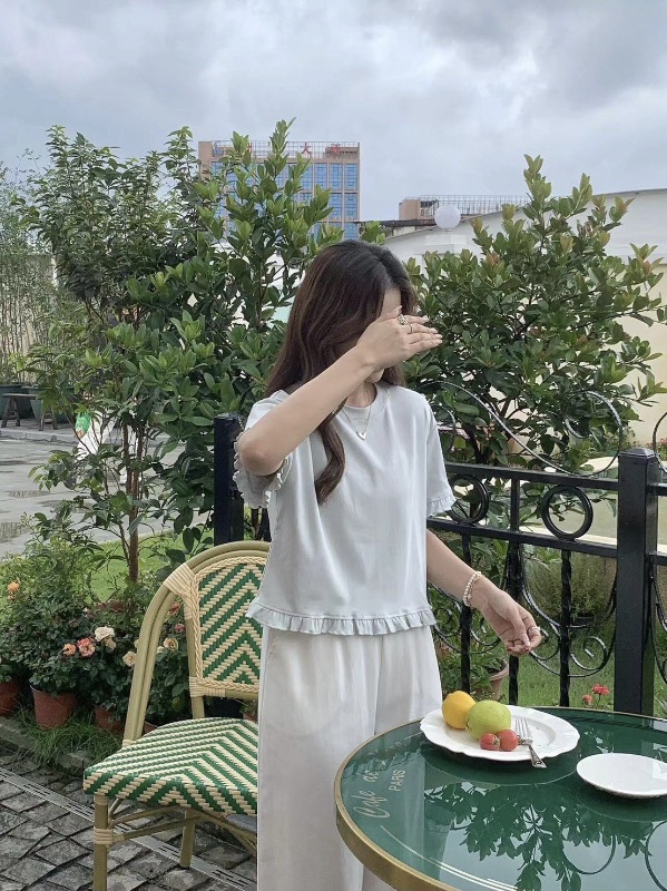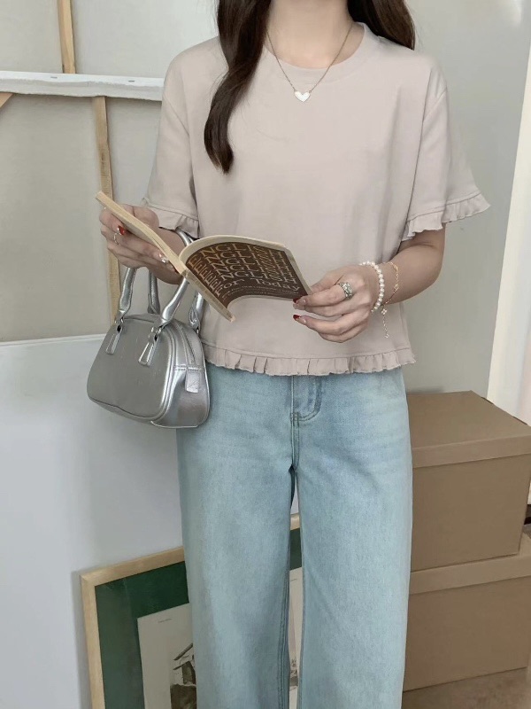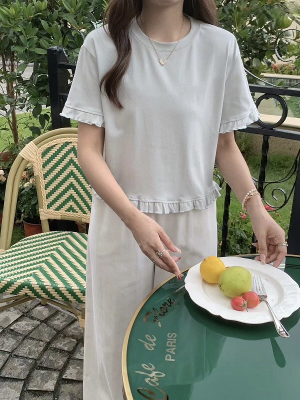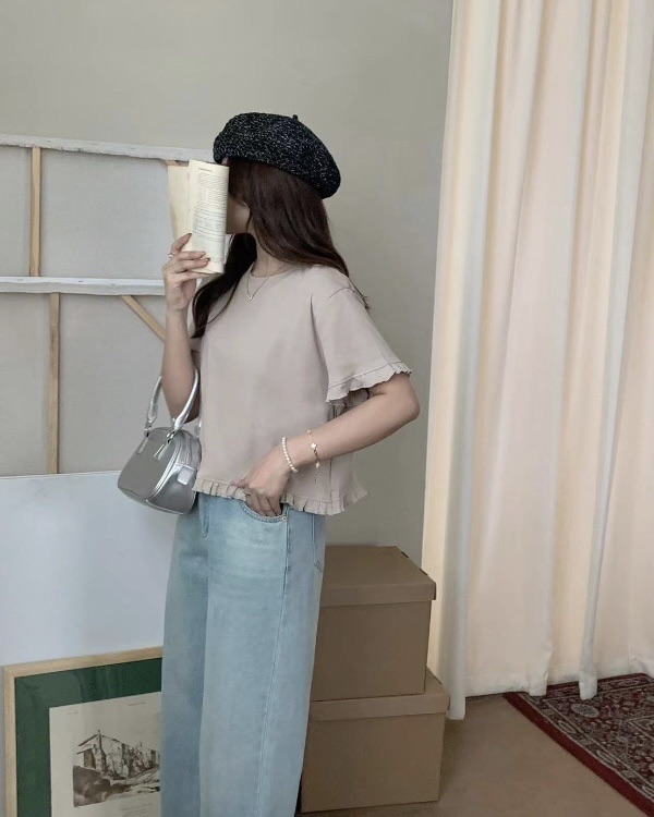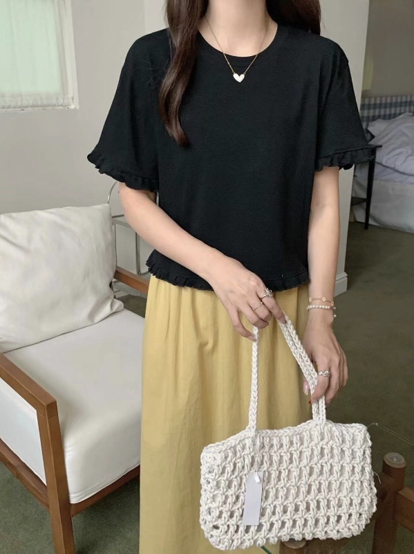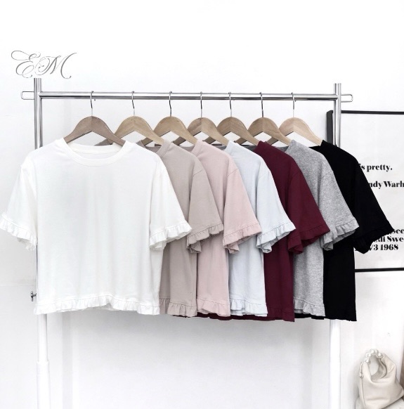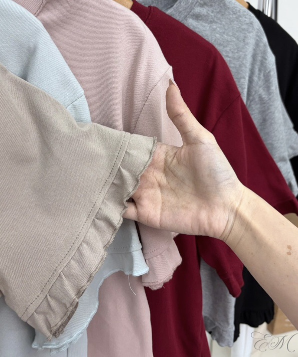 ✨ 袖口荷葉邊設計 甜美可愛 ✨ 下擺荷葉邊剪裁 增加層次感 ✨ 微寬鬆版型 舒適不貼身 ✨ 柔軟親膚布料 透氣好穿 尺寸:胸51 長47 顏色:白 /卡/ 藍/ 粉 / 紅 / 灰/ 黑