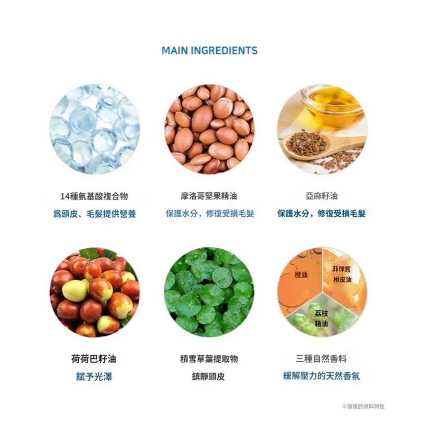 🔘摩洛哥堅果精油、亞麻籽油、荷荷巴籽油保護水分,修復受損毛髮,賦予秀髮光澤