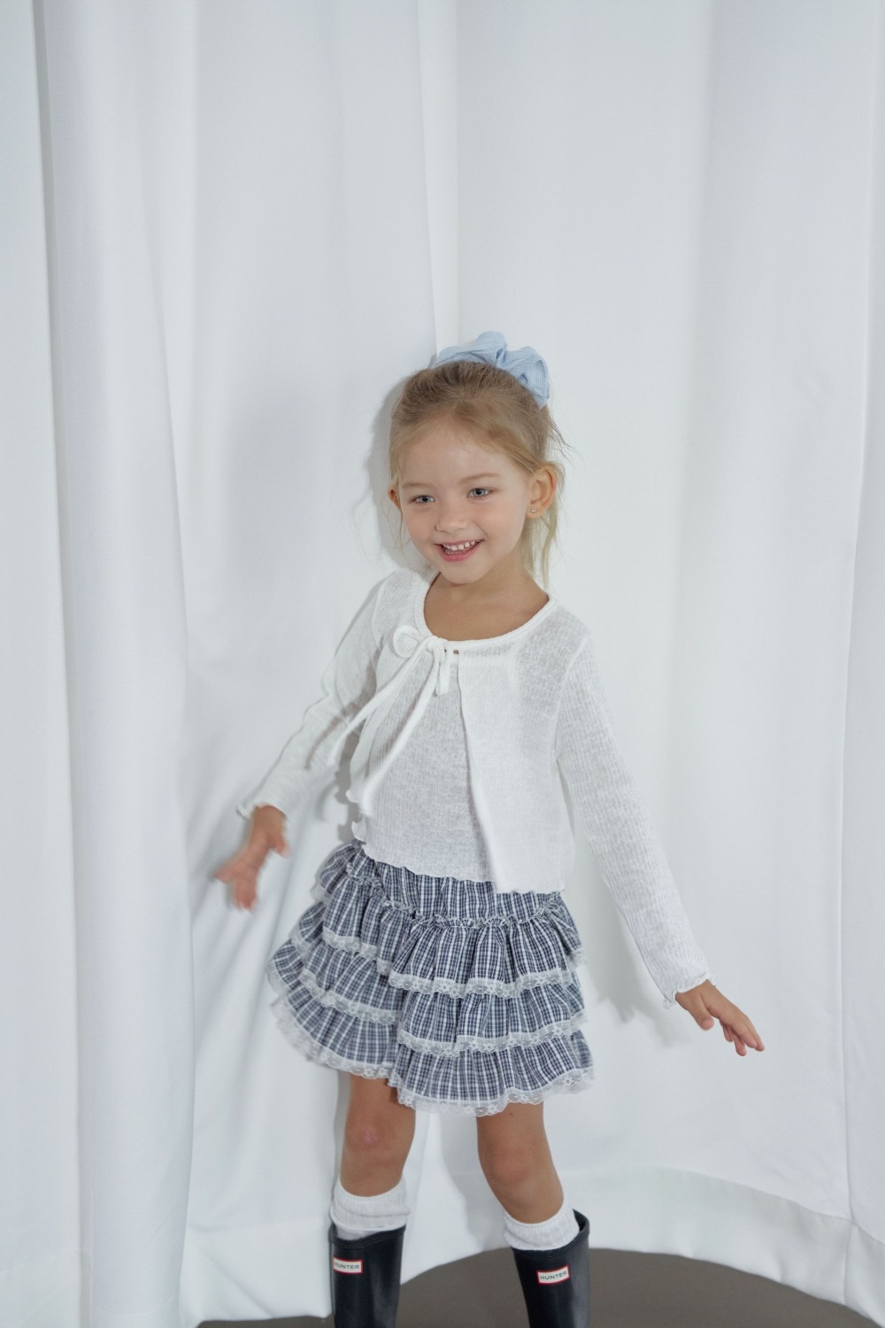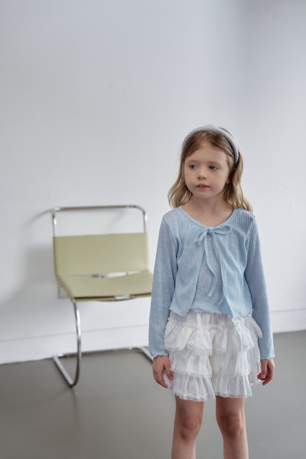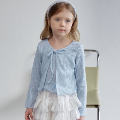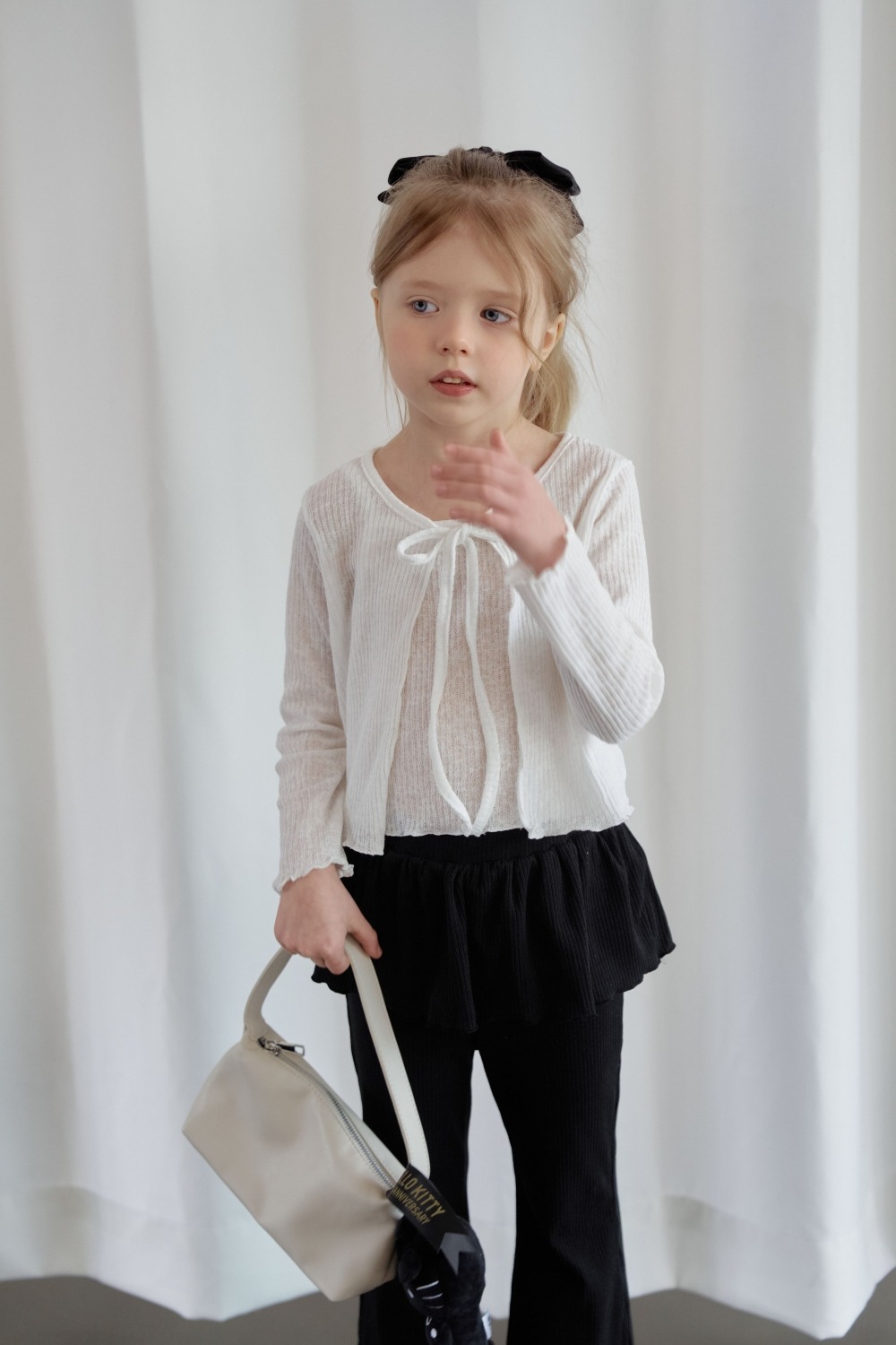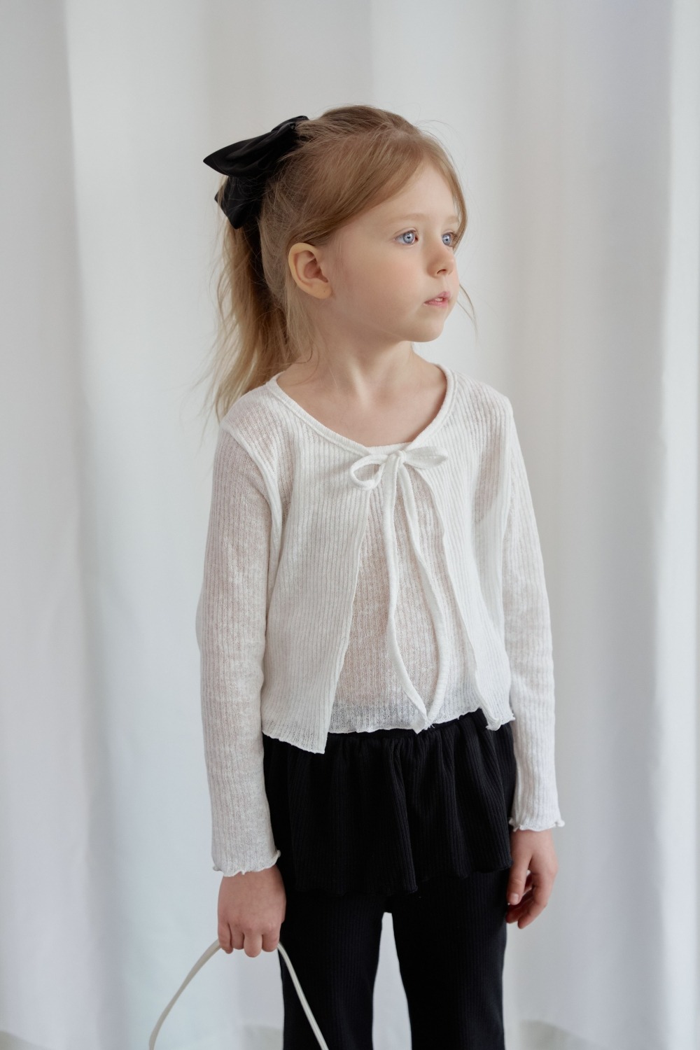 內搭修身小背心,外罩繫帶長袖短版罩衫,領口的蝴蝶結為視覺增加點睛之筆。