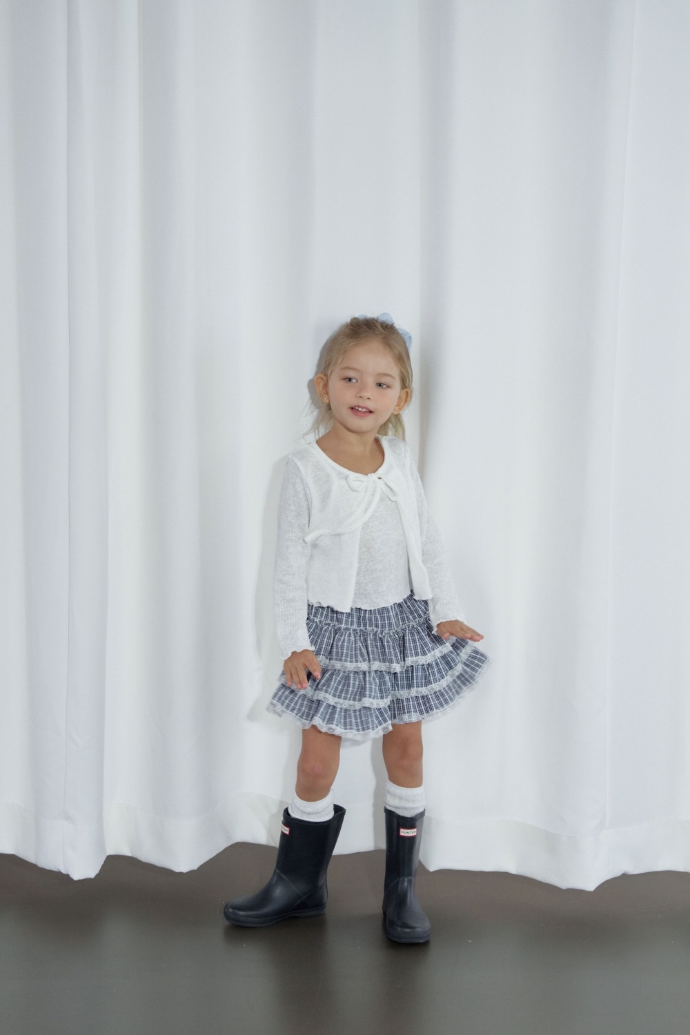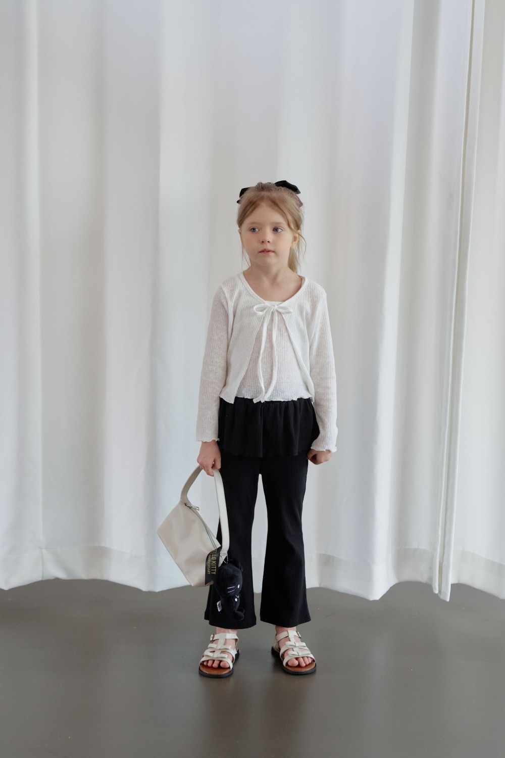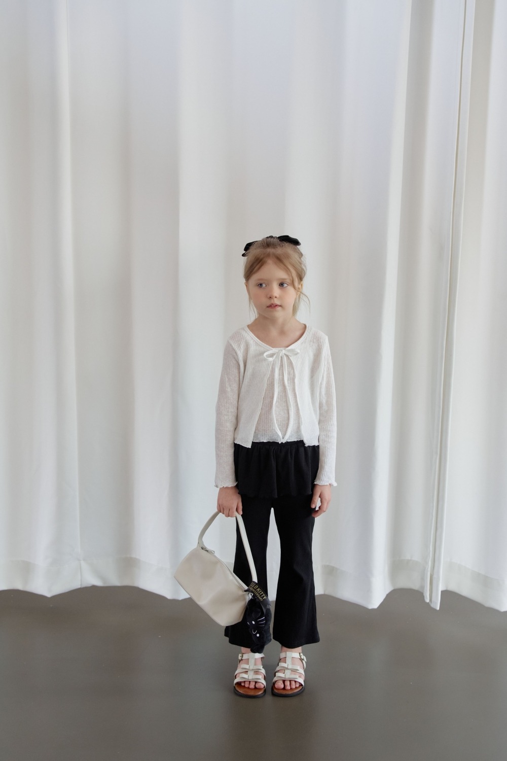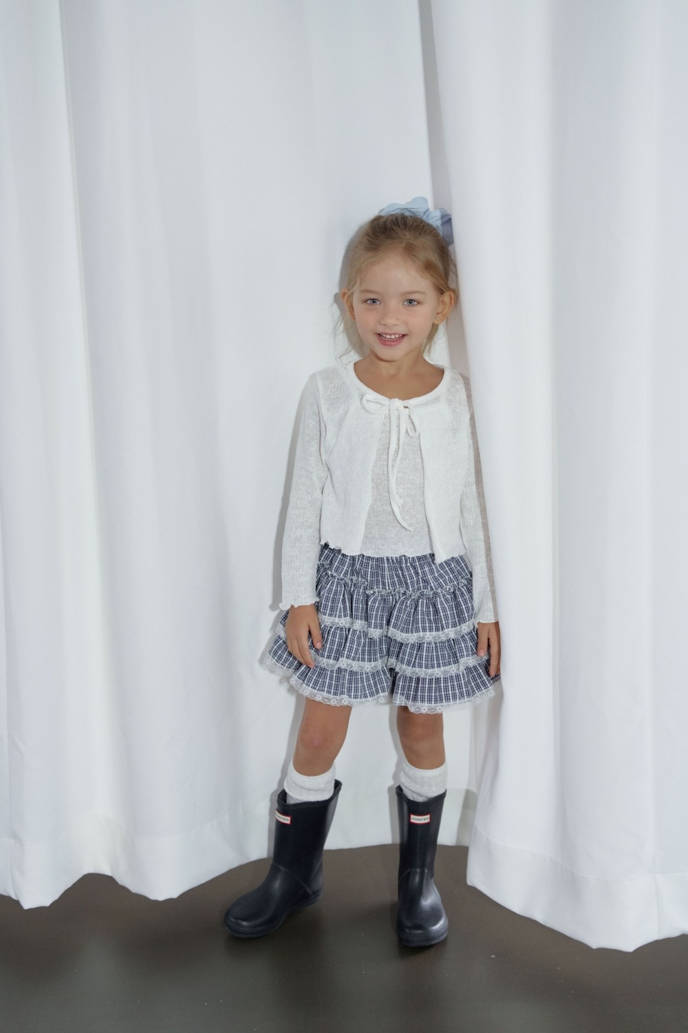 內搭修身小背心,外罩繫帶長袖短版罩衫,領口的蝴蝶結為視覺增加點睛之筆。