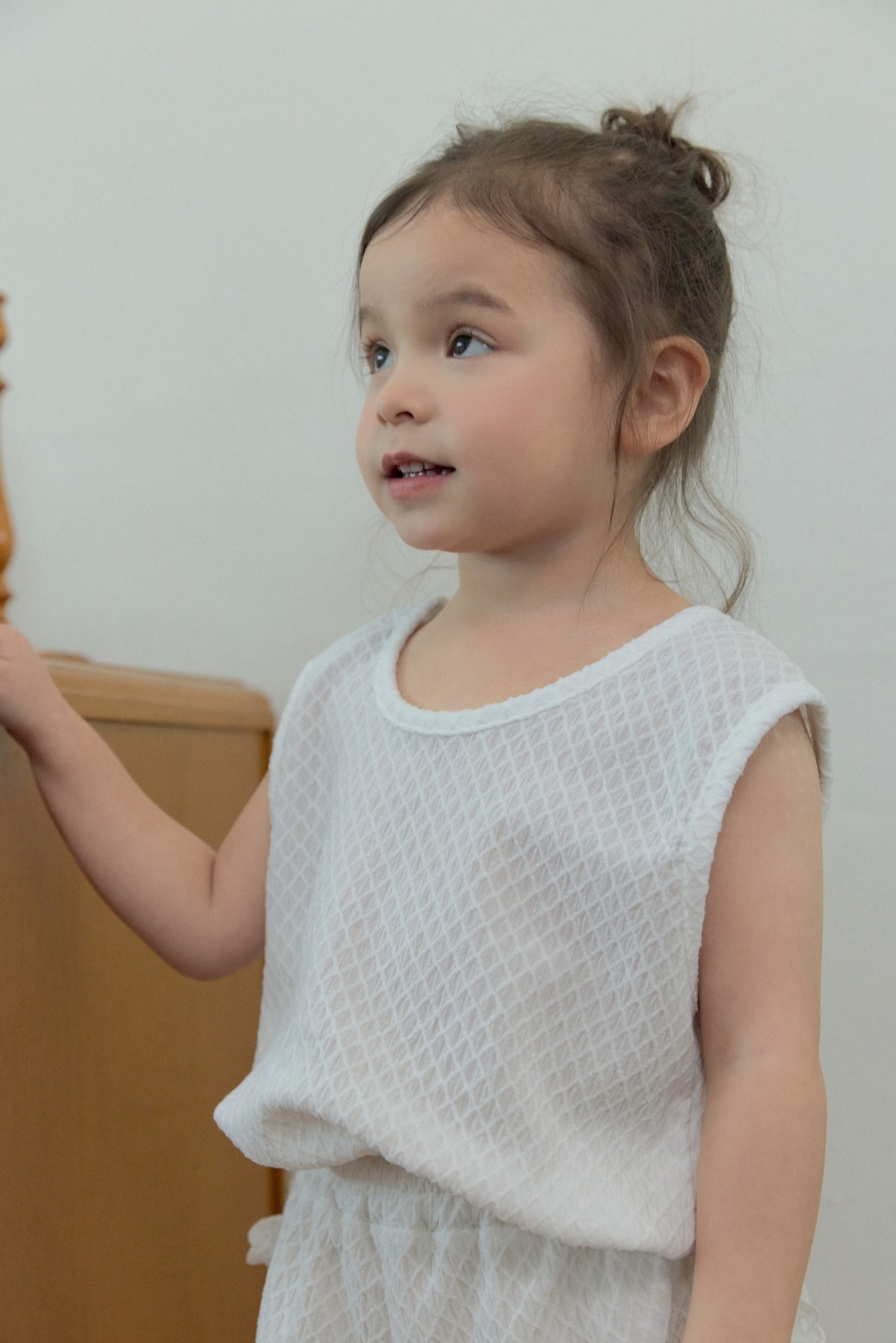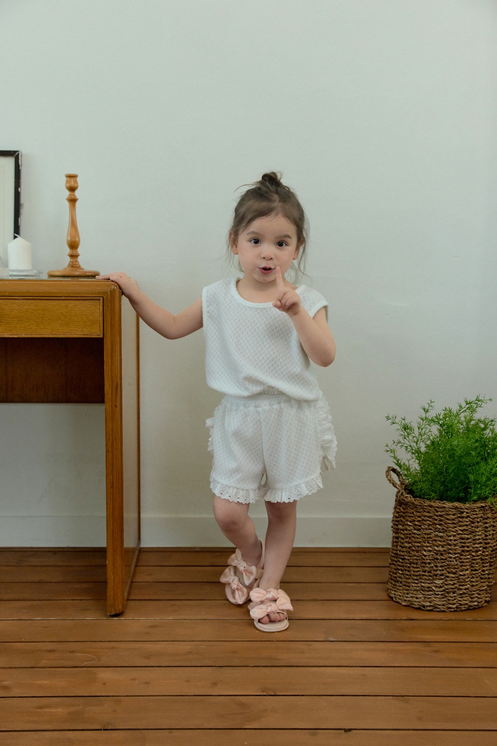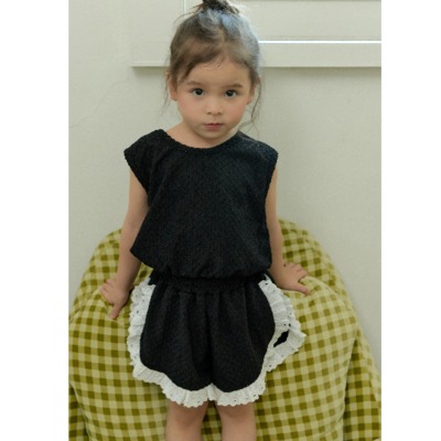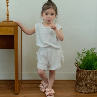 上衣的小飛袖剪裁俐落肉肉手臂顯得可愛,下身短褲特別點綴了精緻的白色蕾絲滾邊,