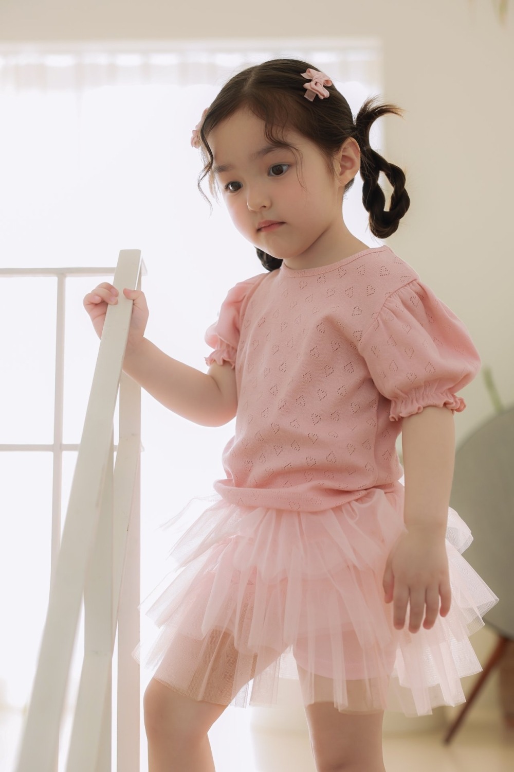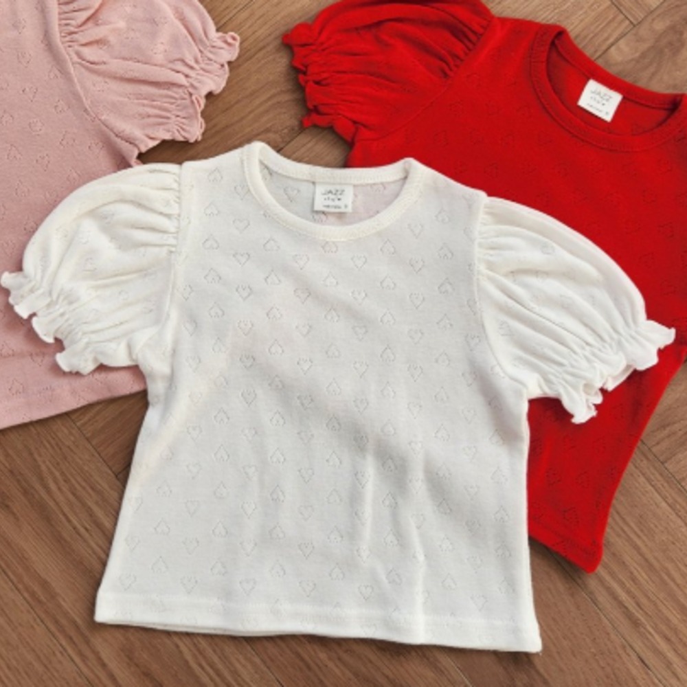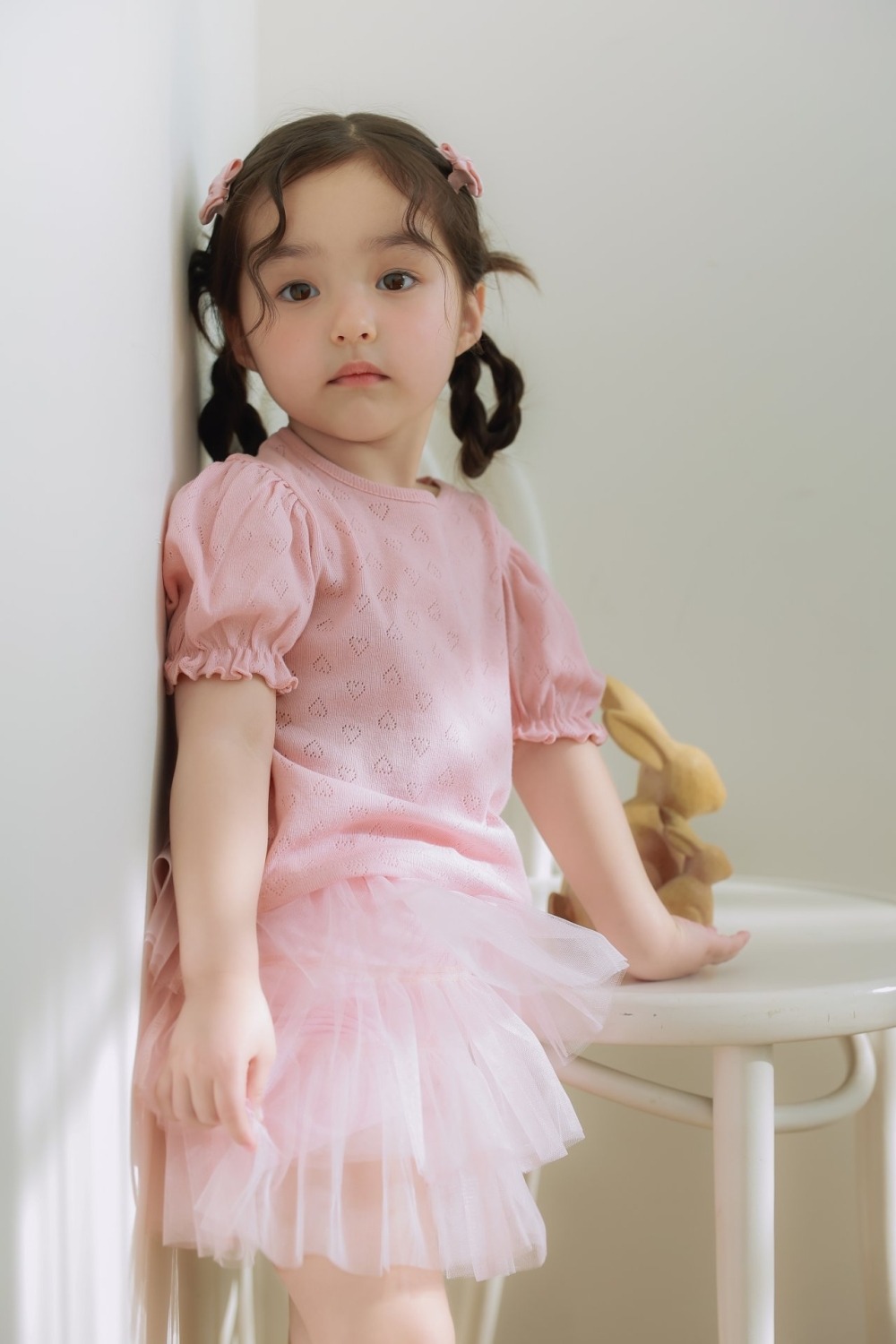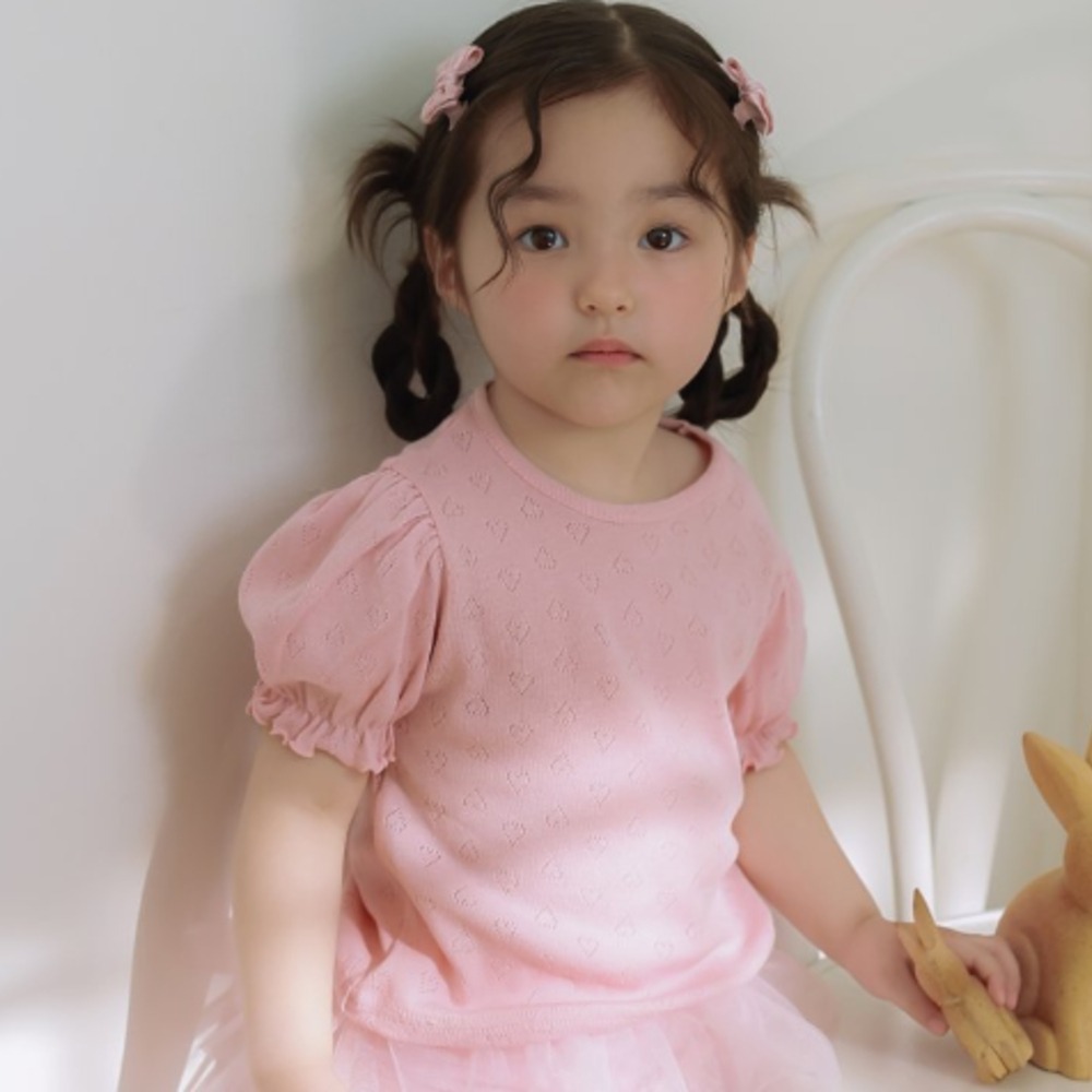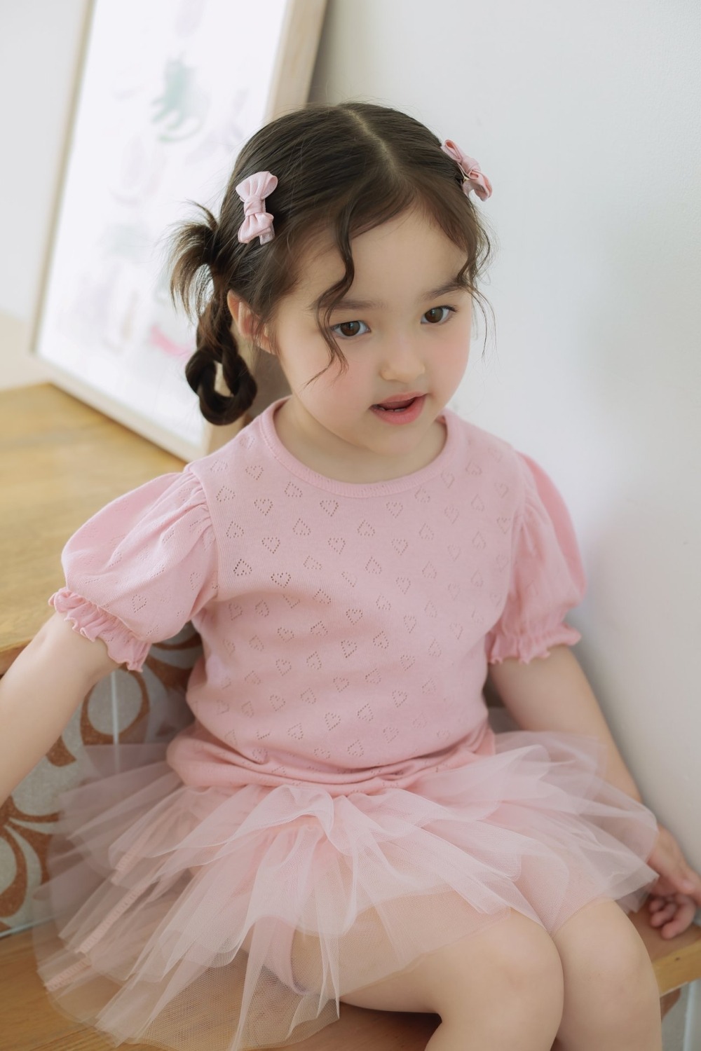 澎澎的復古泡泡袖,布料更是充滿巧思,是精緻的洞洞愛心織紋,透氣又帶點小華麗。