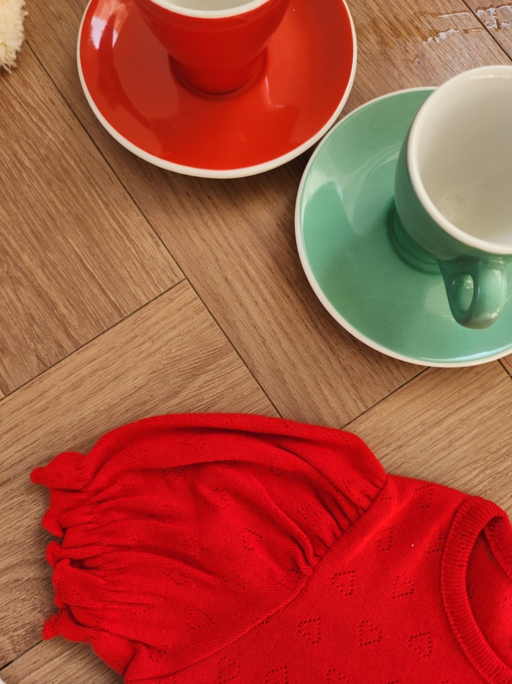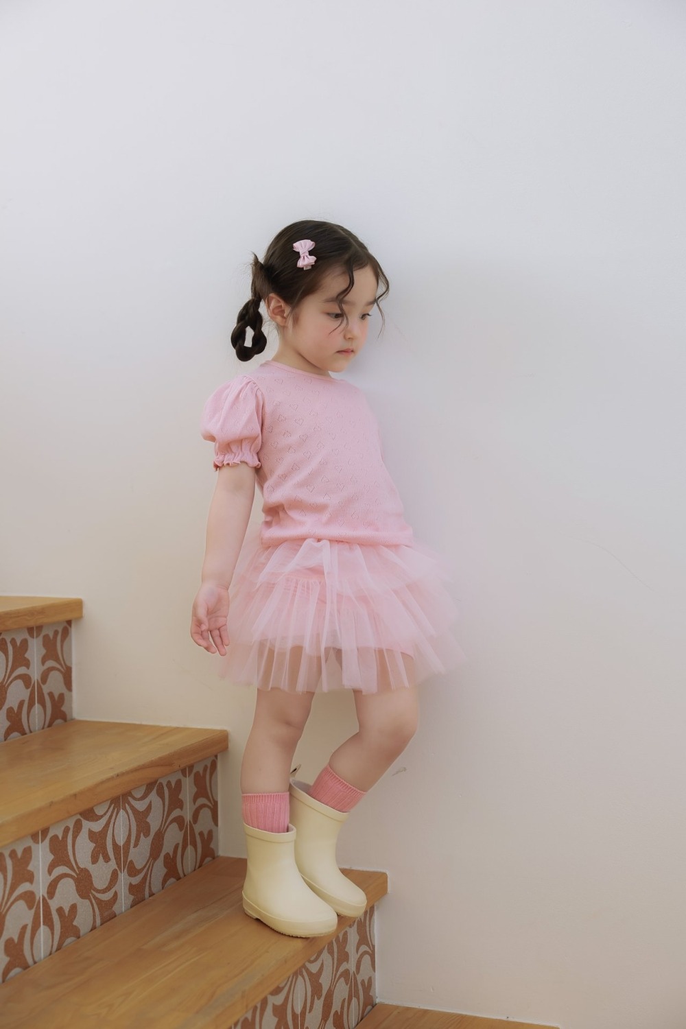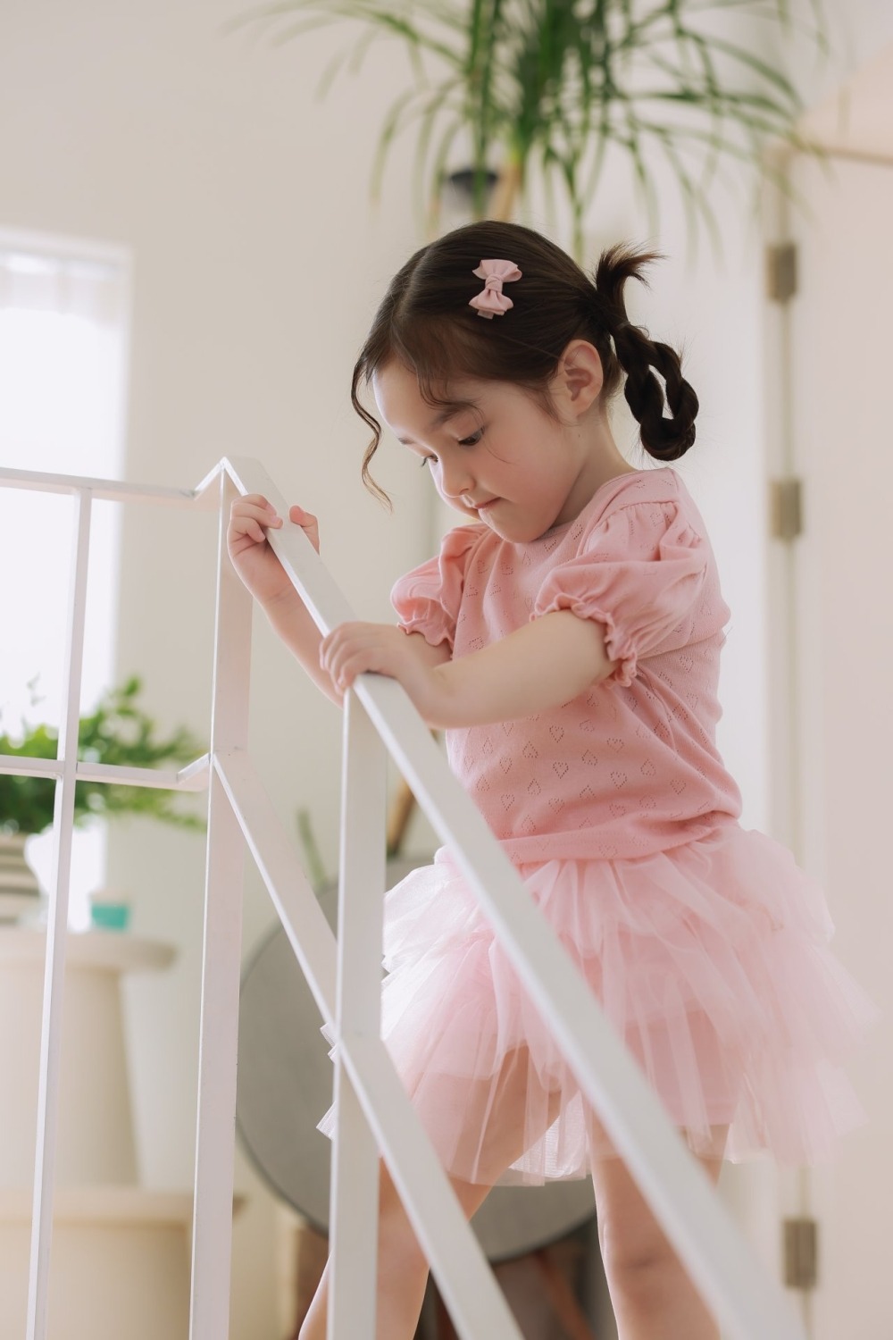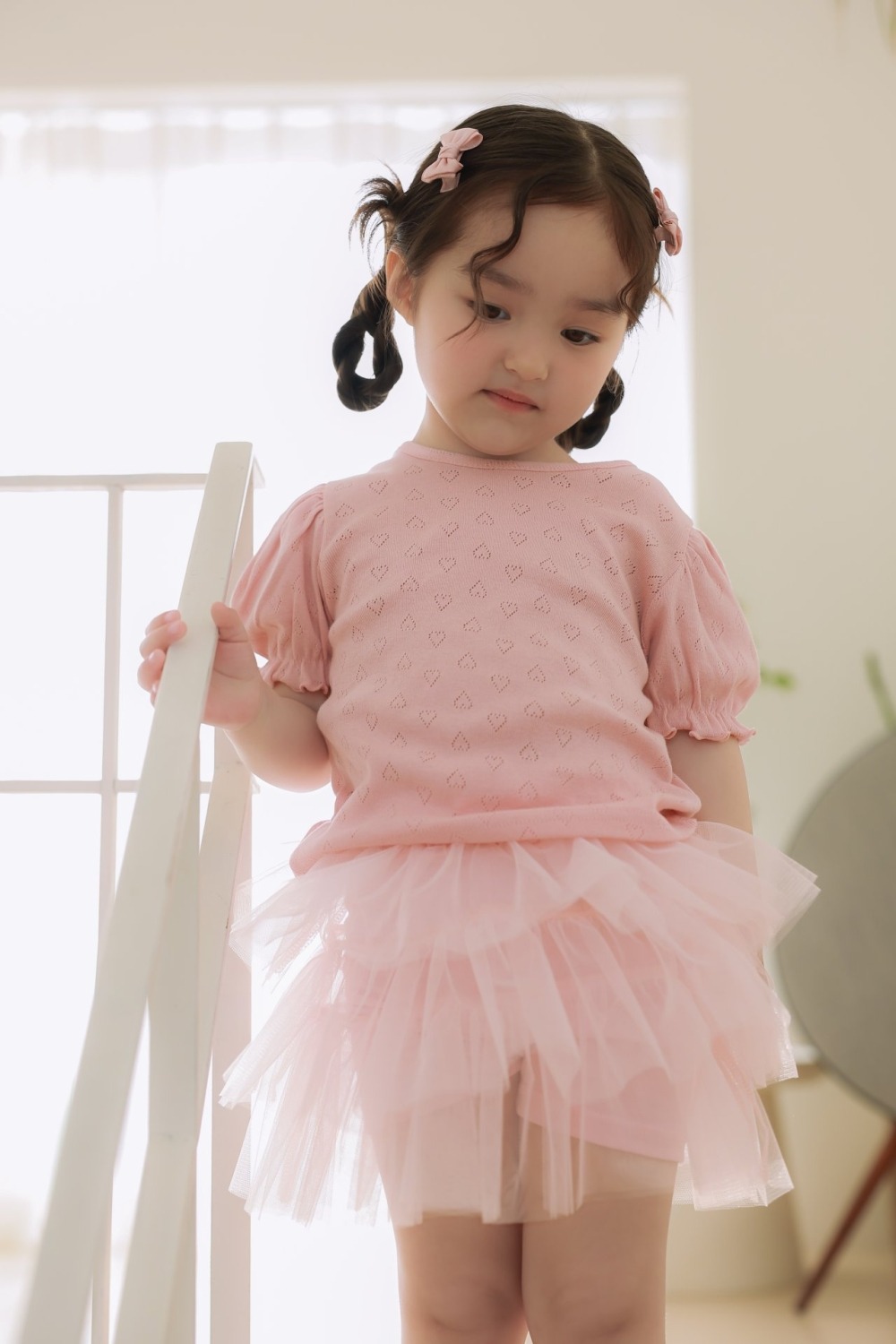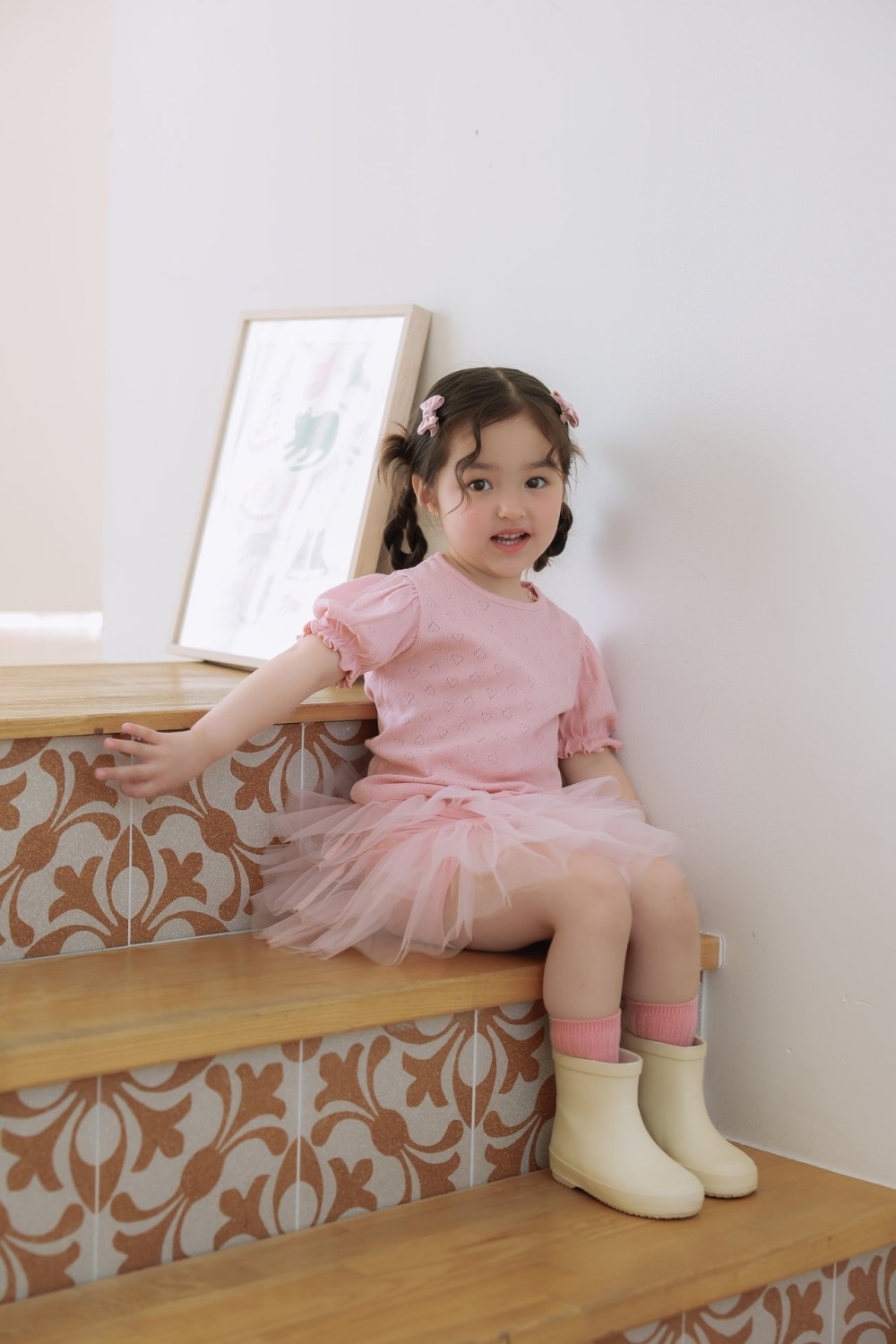 澎澎的復古泡泡袖,布料更是充滿巧思,是精緻的洞洞愛心織紋,透氣又帶點小華麗。