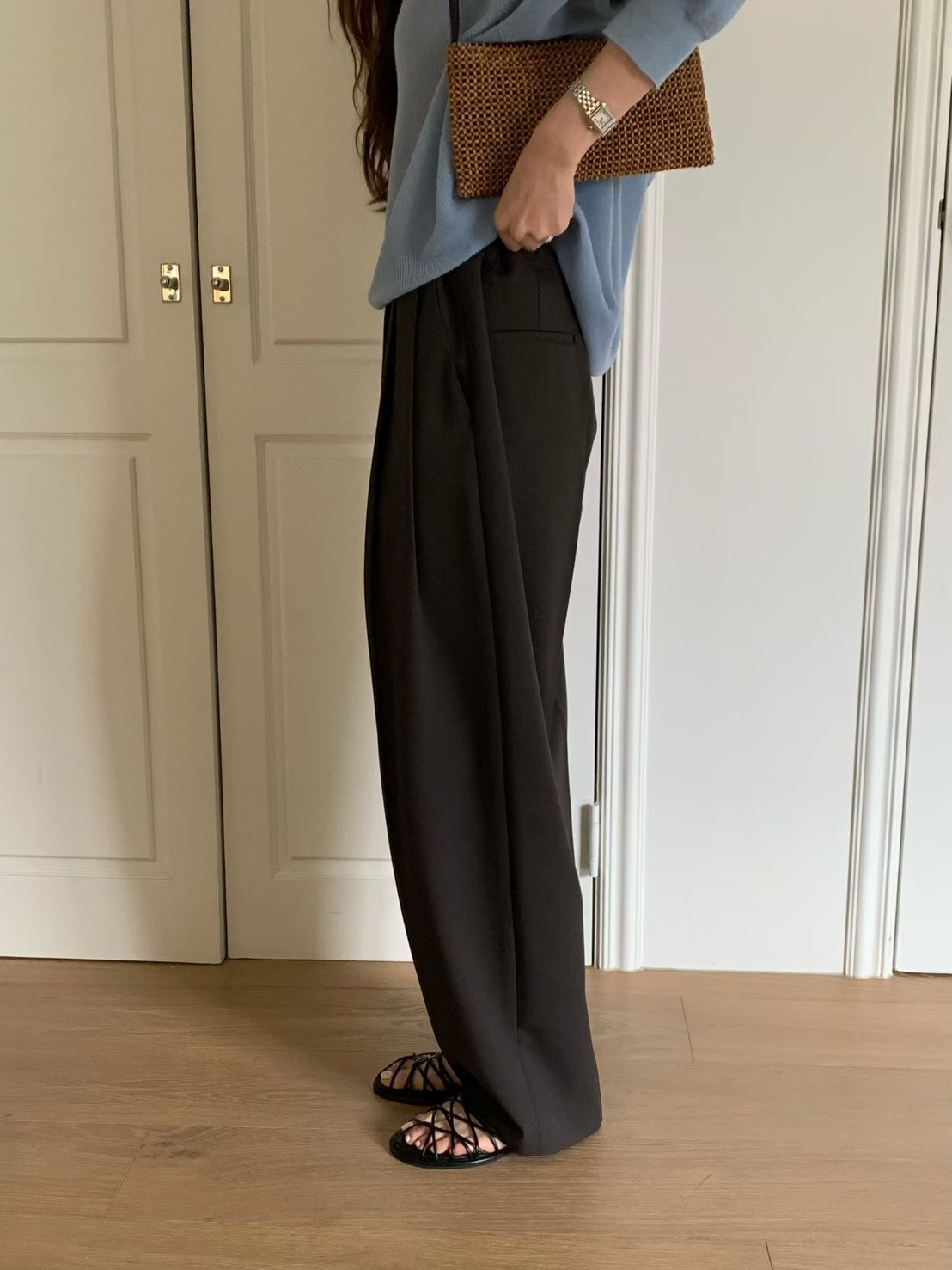 高級垂墜布料:選用春季輕盈卻保有紮實感的面料,走動間的垂墜度非常迷人,不顯假胯寬。