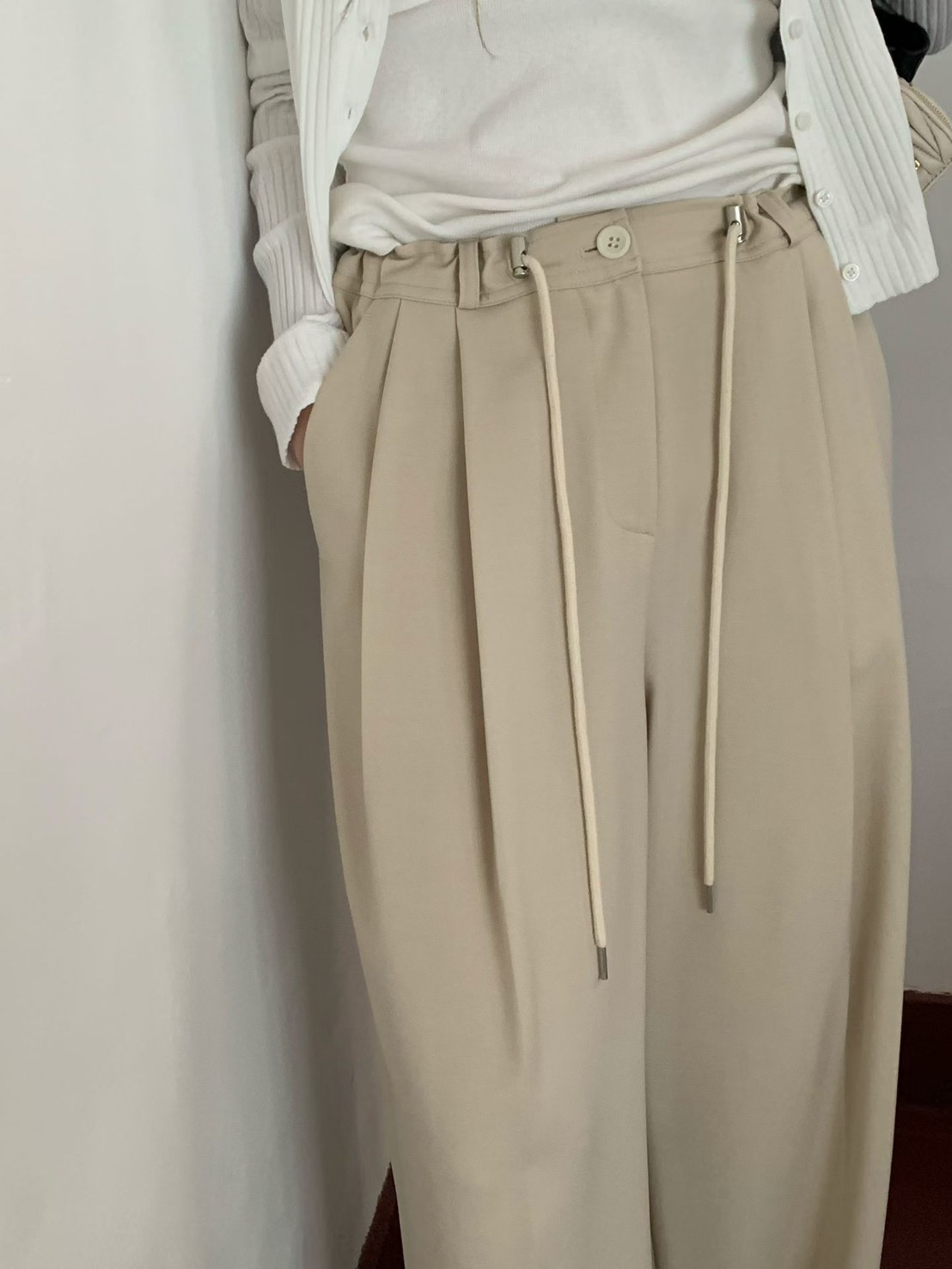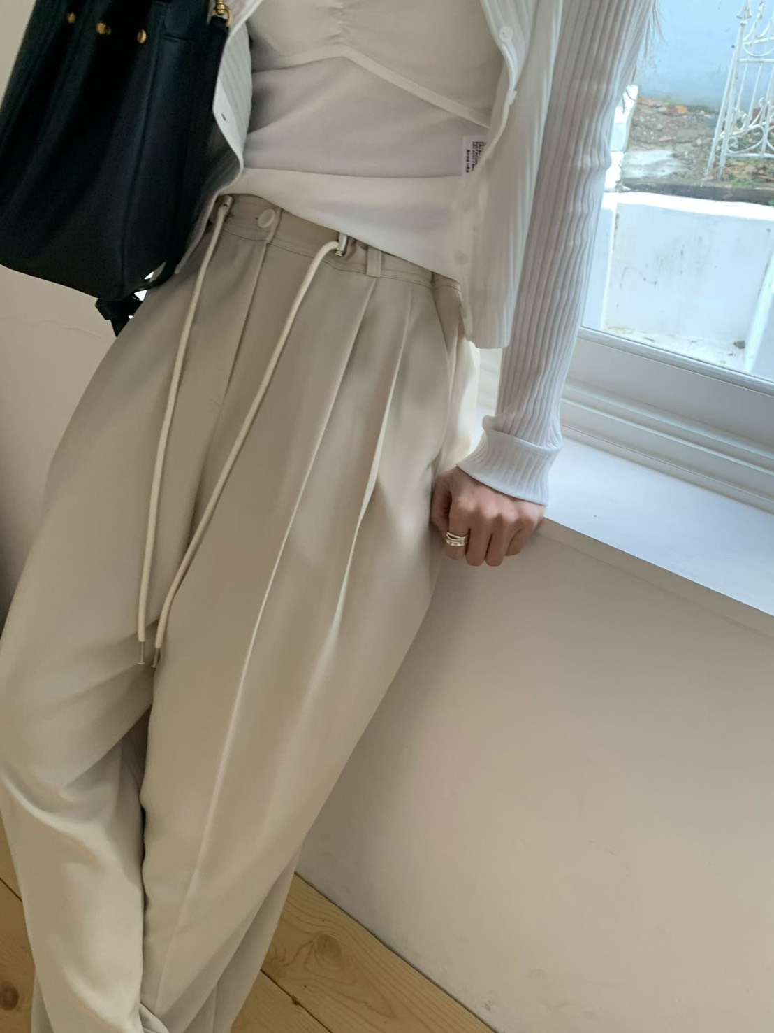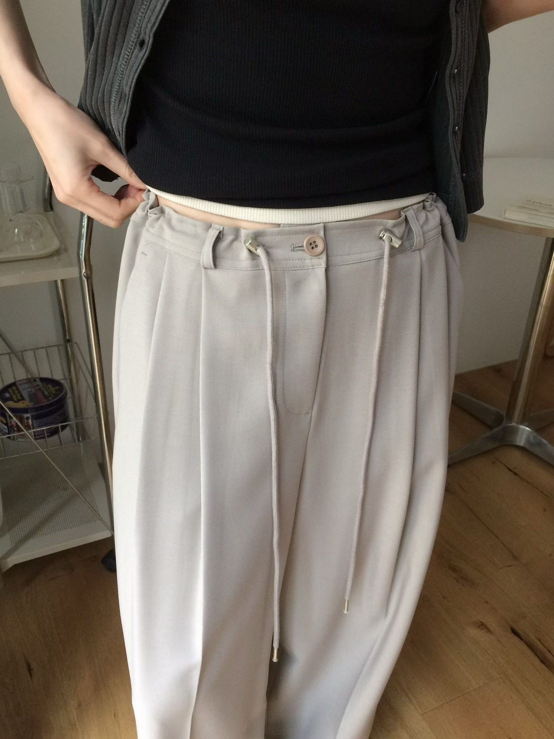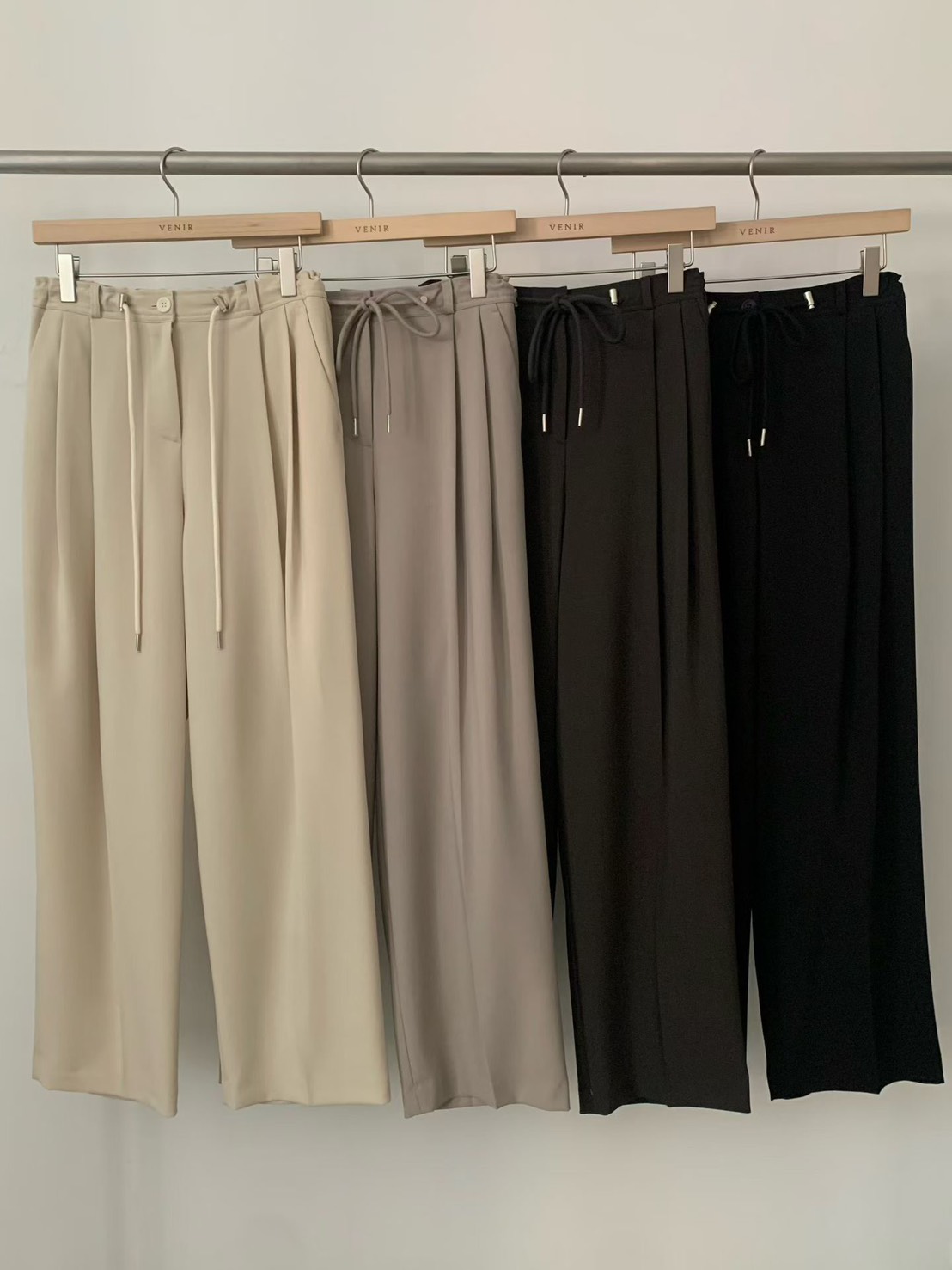 韓國設計師品牌 VENIR 本季最亮眼的休閒神褲! 跳脫傳統鬆緊帶的平庸,這款特別採用了「金屬調釦抽繩設計」,讓妳隨心所欲決定腰線高低。不論是想穿出率性的五分垮褲感,還是高腰延伸長腿比例,一拉即合。