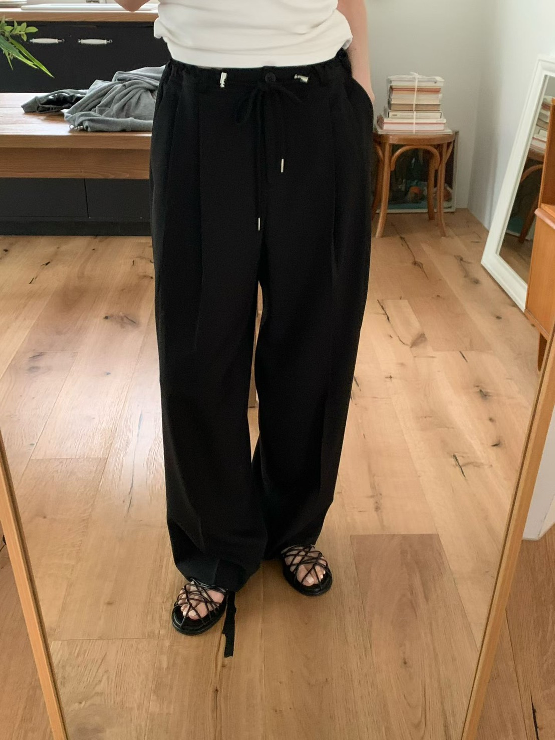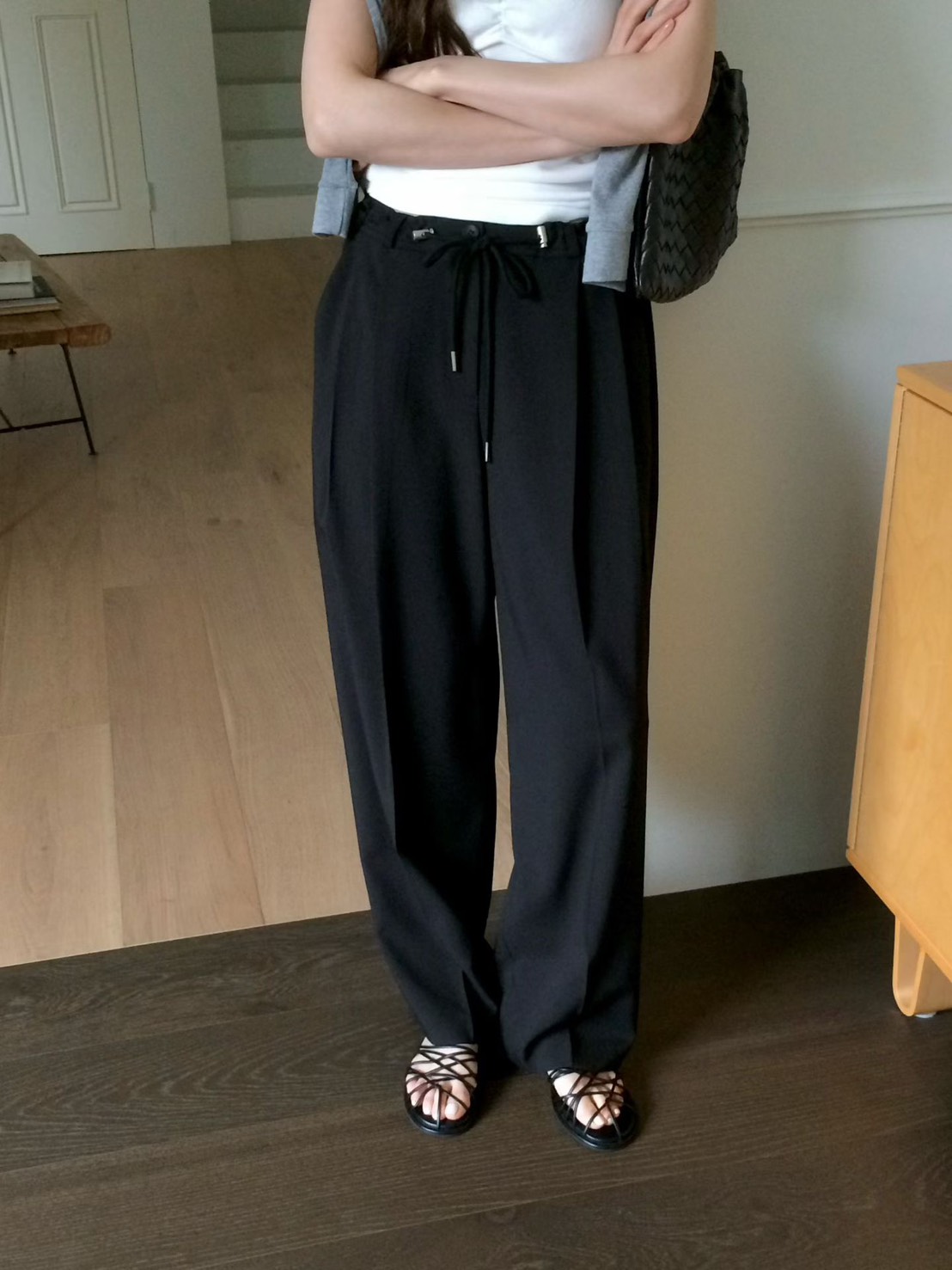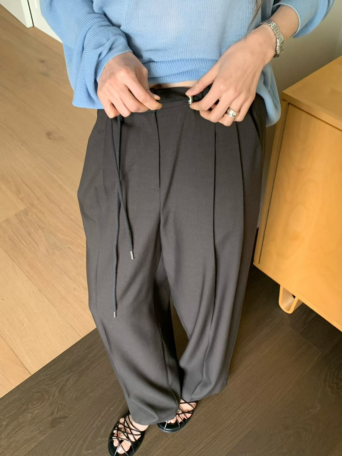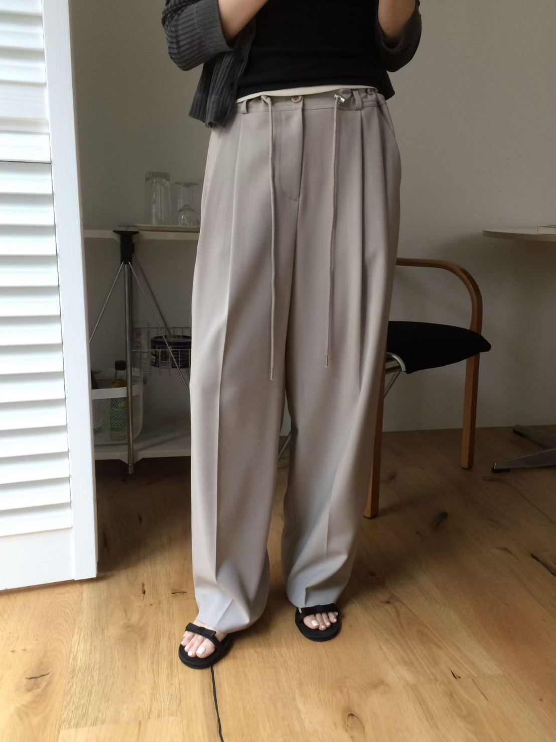 韓國設計師品牌 VENIR 本季最亮眼的休閒神褲! 跳脫傳統鬆緊帶的平庸,這款特別採用了「金屬調釦抽繩設計」,讓妳隨心所欲決定腰線高低。不論是想穿出率性的五分垮褲感,還是高腰延伸長腿比例,一拉即合。