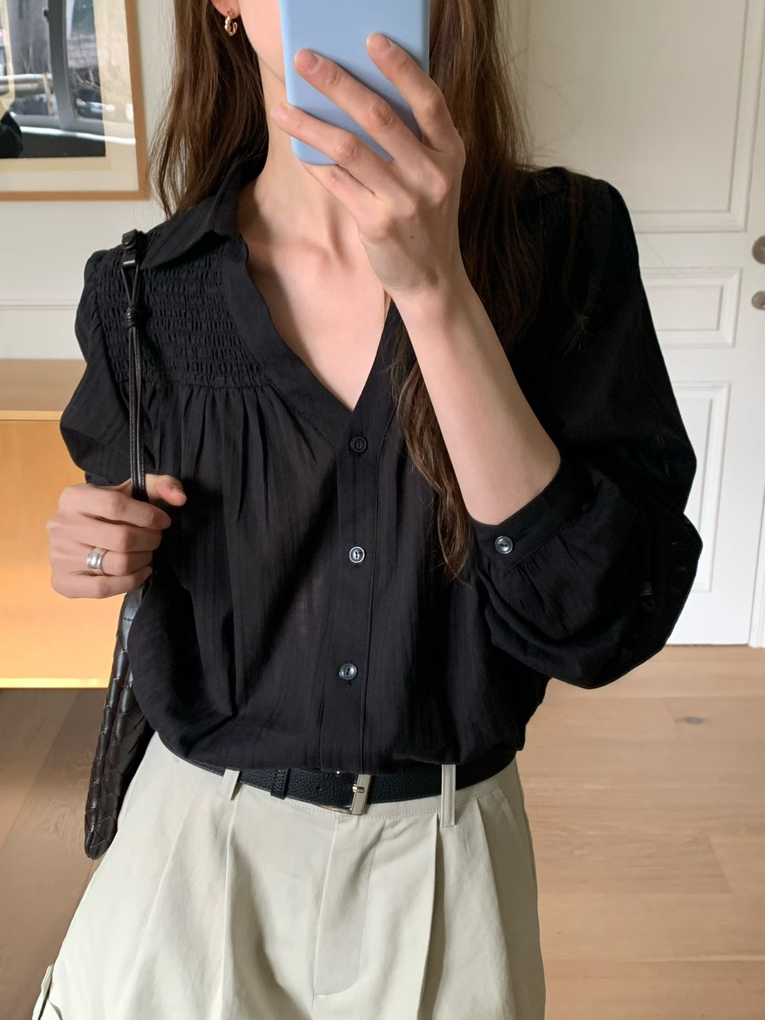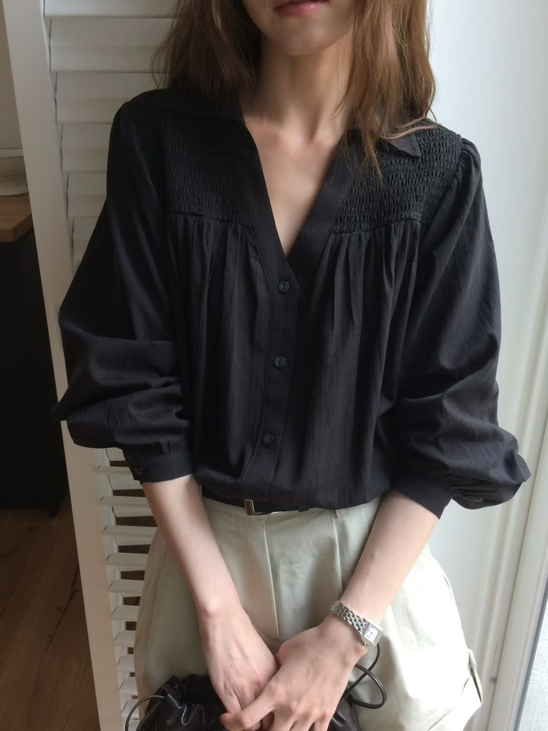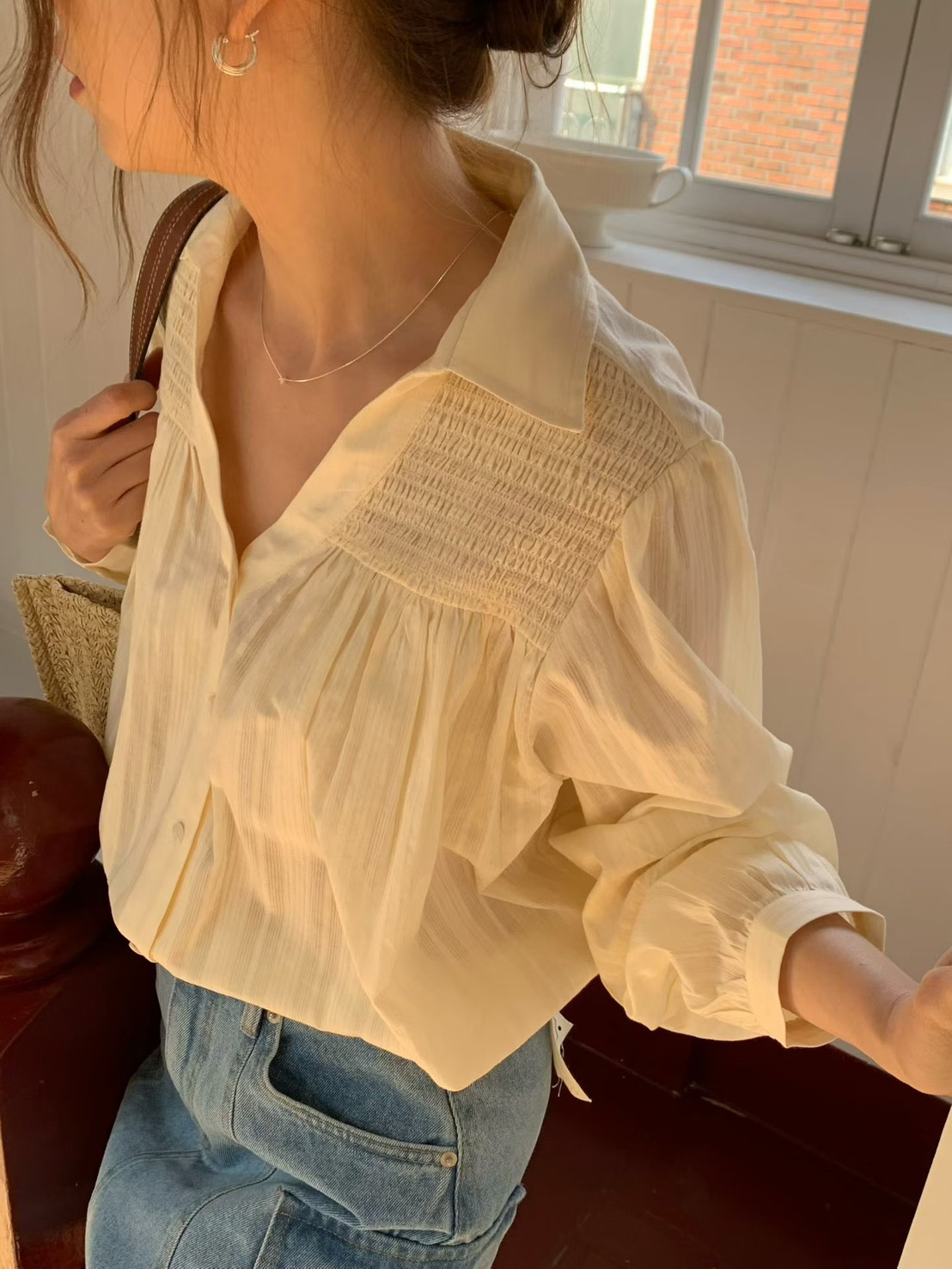 這款襯衫最迷人的地方在於胸前細密的壓褶設計,不僅修飾身型,