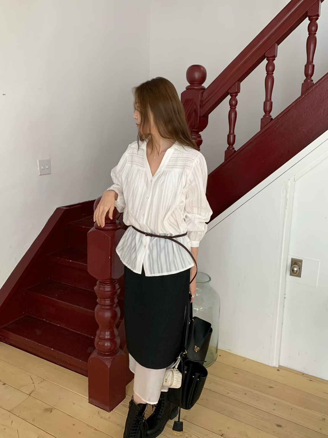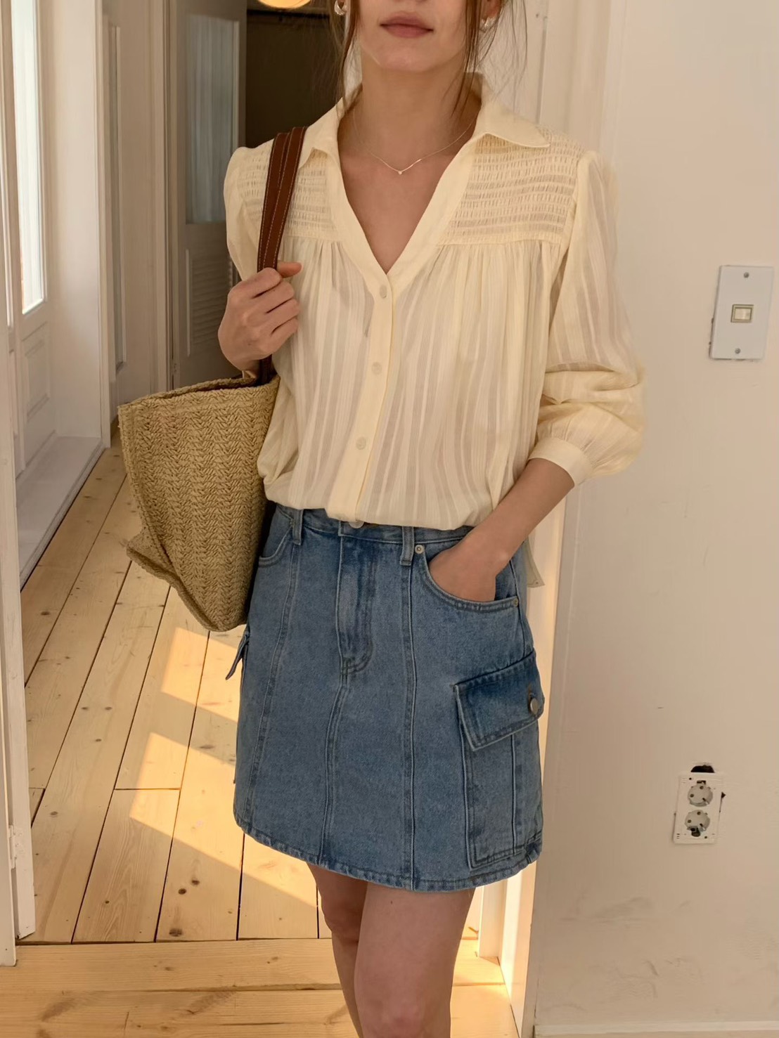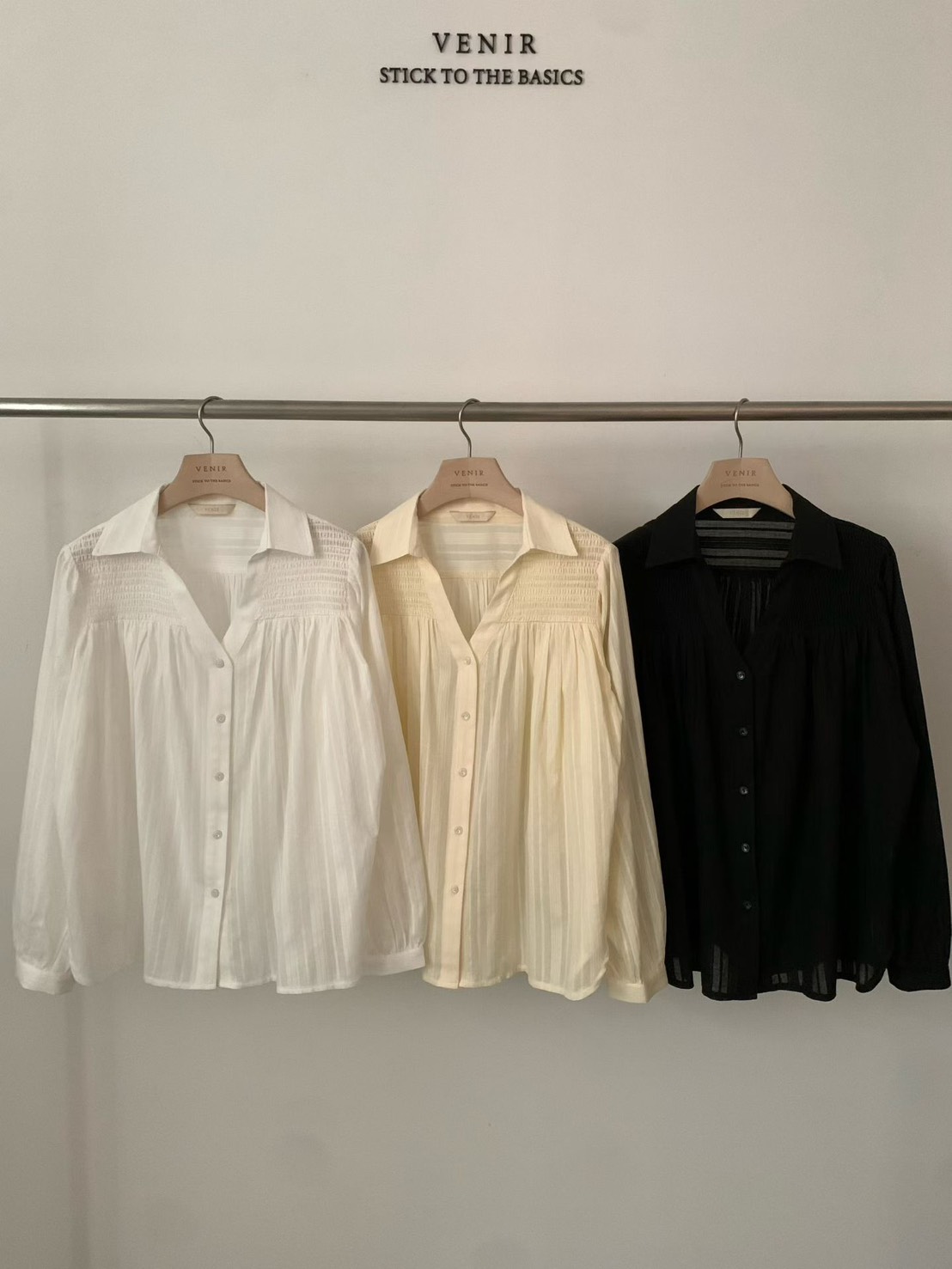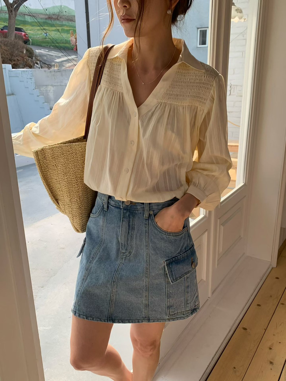 這款襯衫最迷人的地方在於胸前細密的壓褶設計,不僅修飾身型,